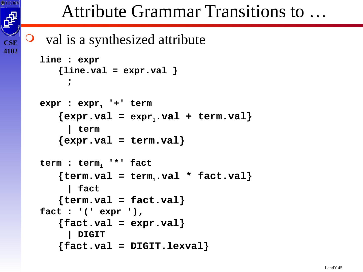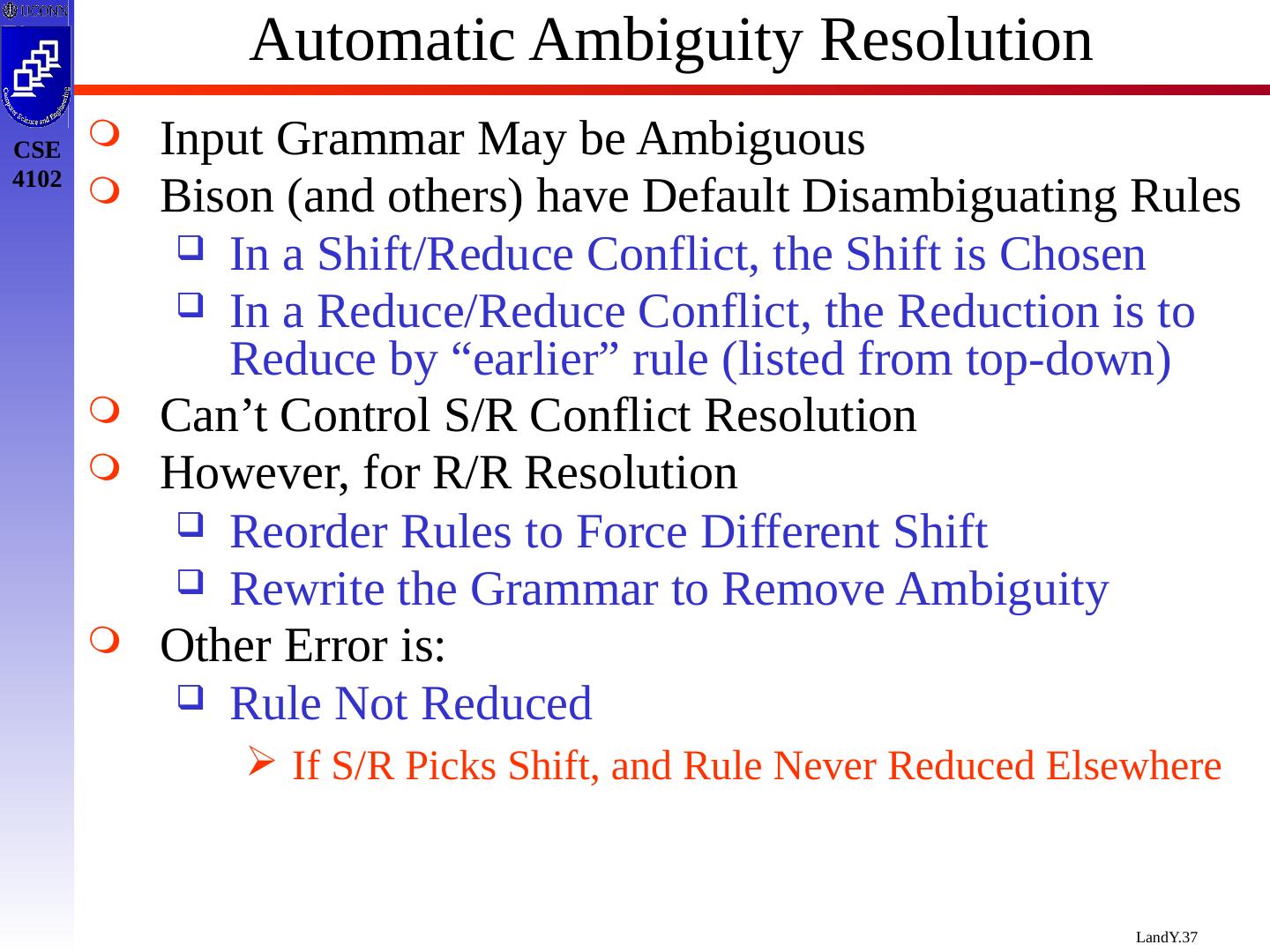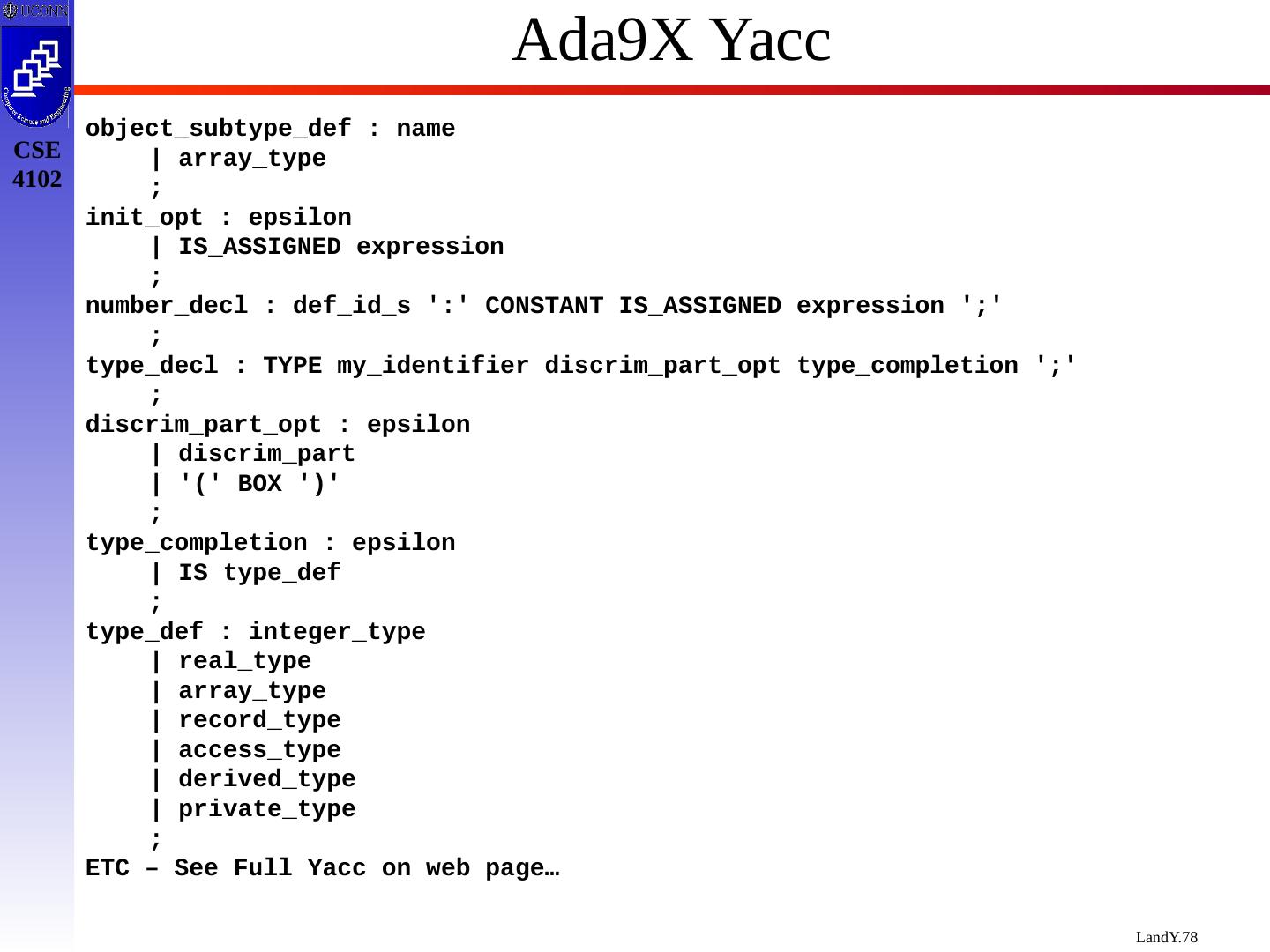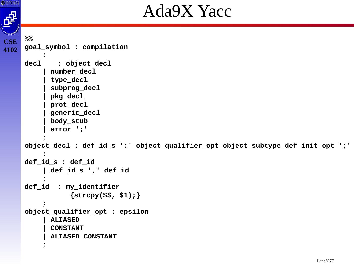 27 .LALR State Machine ( yacc –v *.y) Generates y.output state 0 $accept : _line $end DIGIT shift 6 ( shift 5 . error line goto 1 expr goto 2 term goto 3 fact goto 4 state 1 $accept line_$end $end accept . error state 2 line : expr_ (1) expr : expr_+ term + shift 7 • reduce 1 state 3 expr : term_ (3) term : term_* fact * shift 8 . reduce 3 state 4 term : fact_ (5) . reduce 5 state 5 fact : (_expr ) DIGIT shift 6 ( shift 5 . error expr goto 9 term goto 3 fact goto 4 state 6 fact : DIGIT (7) . reduce 7 state 7 expr : expr +_term DIGIT shift 6 ( shift 5 . error term goto 10 U fact goto 4 state 8 term : term *_fact DIGIT shift 6 ( shift 5 . error fact goto 11