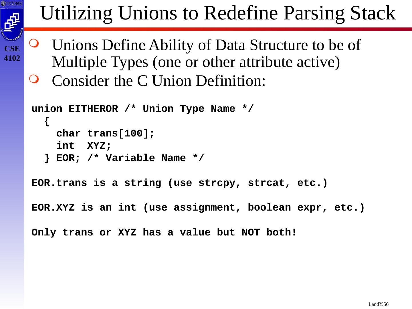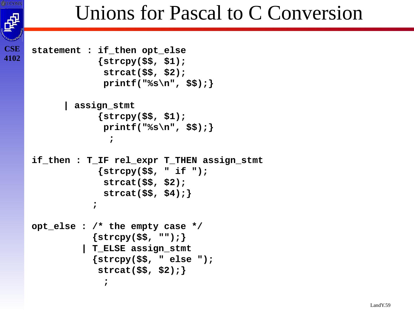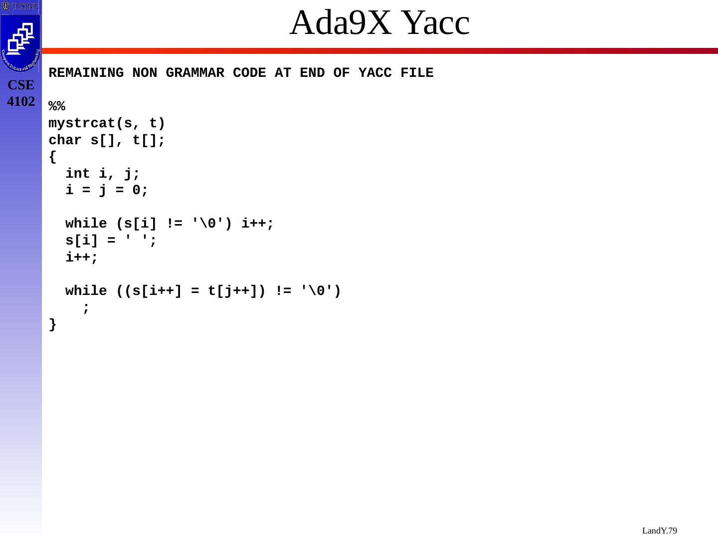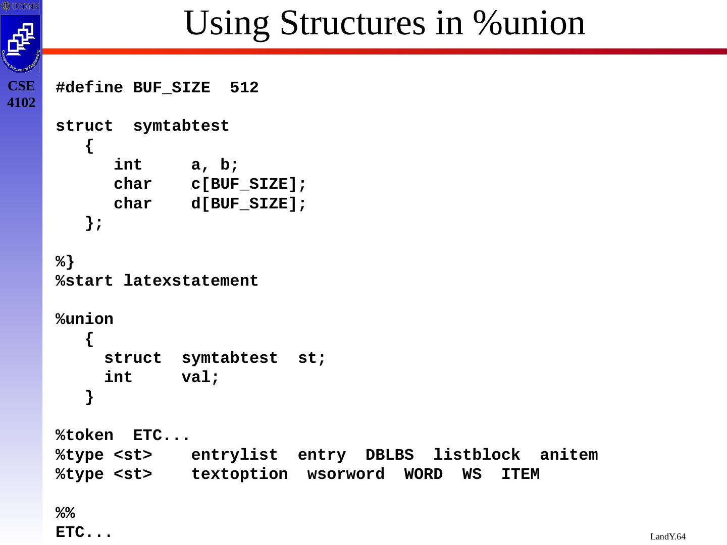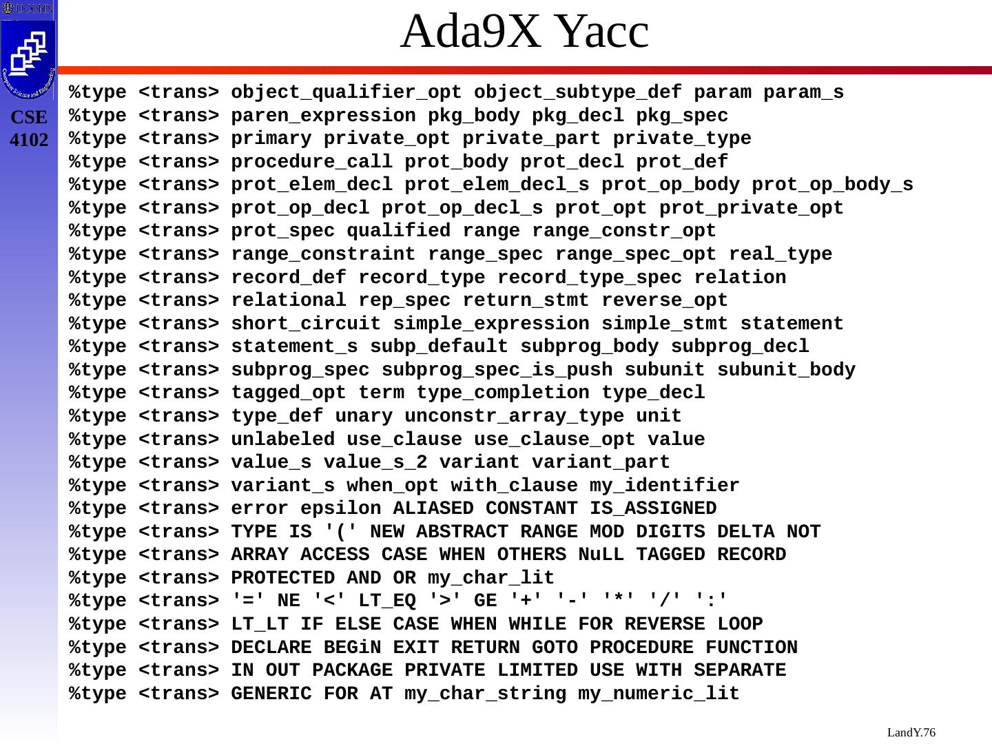 27 .LALR State Machine ( yacc –v *.y) Generates y.output state 0 $accept : _line $end DIGIT shift 6 ( shift 5 . error line goto 1 expr goto 2 term goto 3 fact goto 4 state 1 $accept line_$end $end accept . error state 2 line : expr_ (1) expr : expr_+ term + shift 7 • reduce 1 state 3 expr : term_ (3) term : term_* fact * shift 8 . reduce 3 state 4 term : fact_ (5) . reduce 5 state 5 fact : (_expr ) DIGIT shift 6 ( shift 5 . error expr goto 9 term goto 3 fact goto 4 state 6 fact : DIGIT (7) . reduce 7 state 7 expr : expr +_term DIGIT shift 6 ( shift 5 . error term goto 10 U fact goto 4 state 8 term : term *_fact DIGIT shift 6 ( shift 5 . error fact goto 11