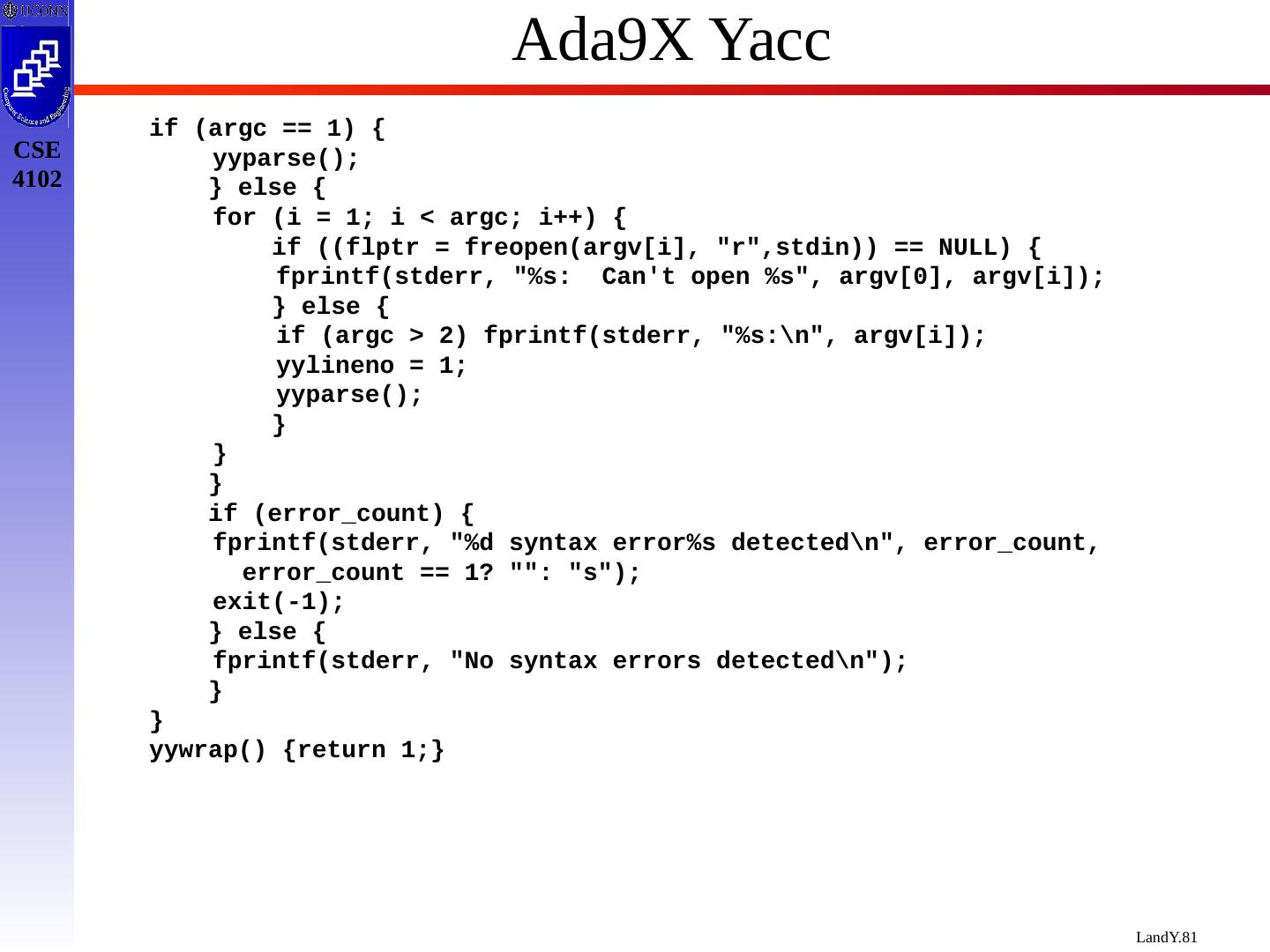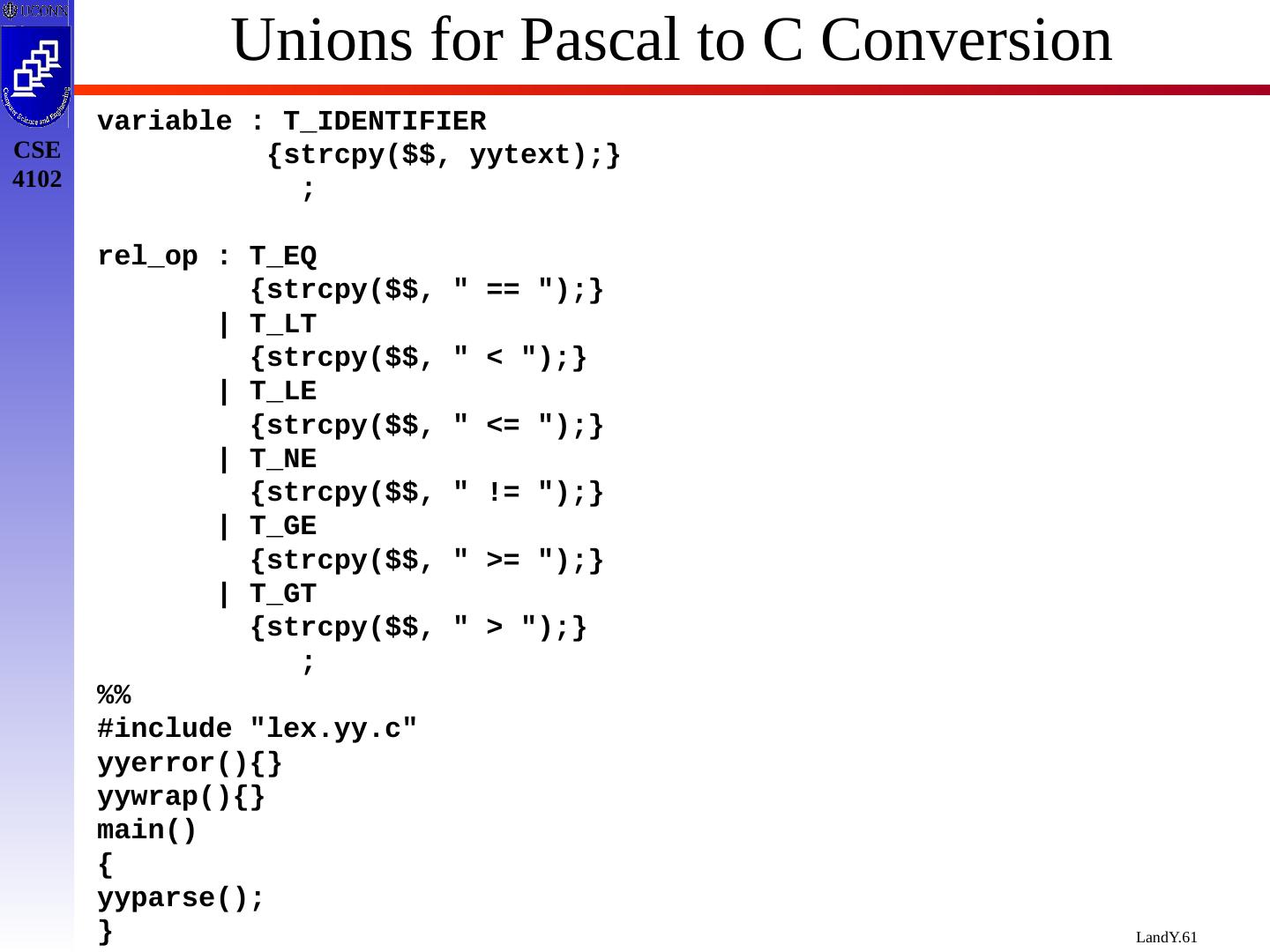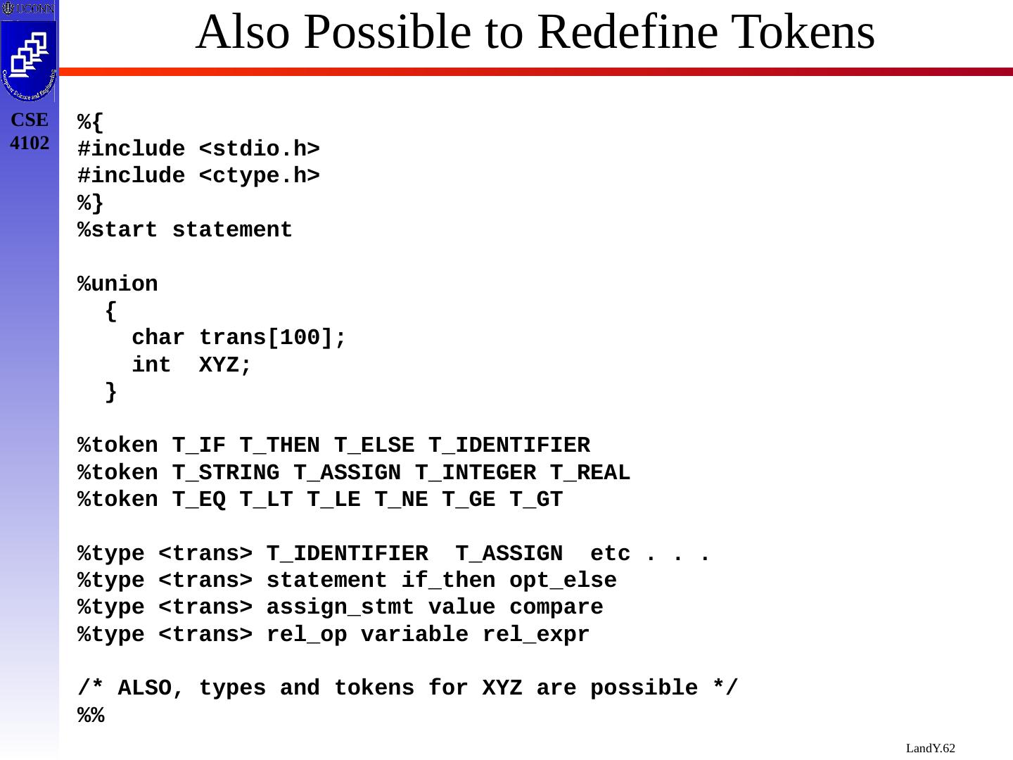7 ."then" { #ifdef PRNTFLG printf(" %s ", yytext); #endif return(T_THEN); } "<=" {printf(" %s ", yytext);return(T_EQ);} "<" {printf(" %s ", yytext);return(T_LT);} "<>" {printf(" %s ", yytext);return(T_NE);} ">=" {printf(" %s ", yytext);return(T_GE);} ">" {printf(" %s ", yytext);return(T_GT);} {id} {printf(" %s ", yytext);return(T_IDENTIFIER);} {integer} {printf(" %s ", yytext);return(T_INTEGER);} {real} {printf(" %s ", yytext);return(T_REAL);} {string} {printf(" %s ", yytext);return(T_STRING);} {comment} {/* T_COMMENT */} {ws} {/* spaces, tabs, newlines */} %% yywrap(){return 0;} main() { int i; do { i = yylex(); } while (i!=0); } Example lex.l File Conditional compilation action EOF for input Three Variables: yytext = “currenttoken” yylen = 12 yylval = 300 Token Definitions Discard