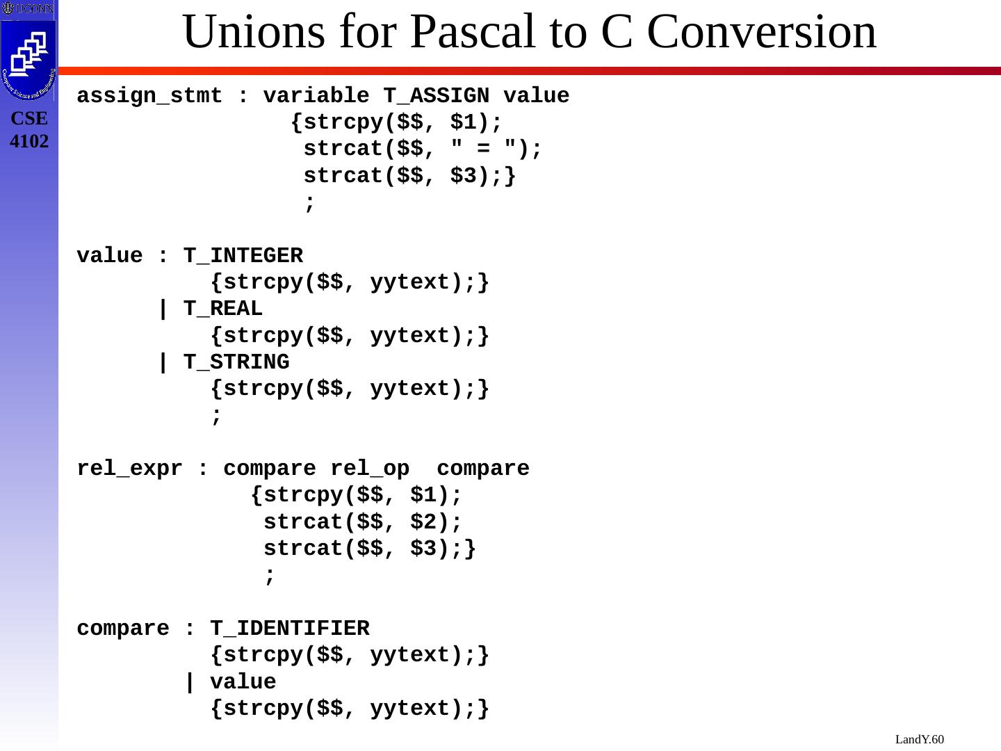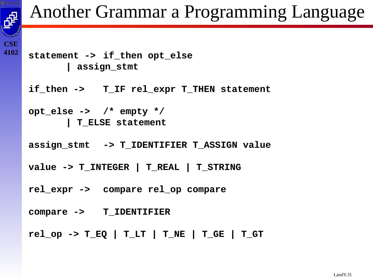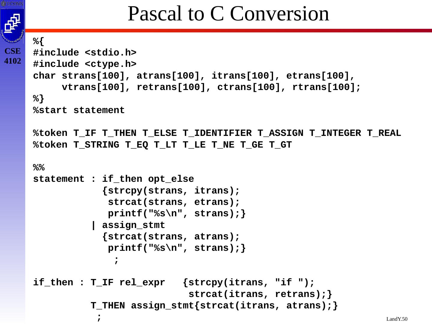7 ."then" { #ifdef PRNTFLG printf(" %s ", yytext); #endif return(T_THEN); } "<=" {printf(" %s ", yytext);return(T_EQ);} "<" {printf(" %s ", yytext);return(T_LT);} "<>" {printf(" %s ", yytext);return(T_NE);} ">=" {printf(" %s ", yytext);return(T_GE);} ">" {printf(" %s ", yytext);return(T_GT);} {id} {printf(" %s ", yytext);return(T_IDENTIFIER);} {integer} {printf(" %s ", yytext);return(T_INTEGER);} {real} {printf(" %s ", yytext);return(T_REAL);} {string} {printf(" %s ", yytext);return(T_STRING);} {comment} {/* T_COMMENT */} {ws} {/* spaces, tabs, newlines */} %% yywrap(){return 0;} main() { int i; do { i = yylex(); } while (i!=0); } Example lex.l File Conditional compilation action EOF for input Three Variables: yytext = “currenttoken” yylen = 12 yylval = 300 Token Definitions Discard