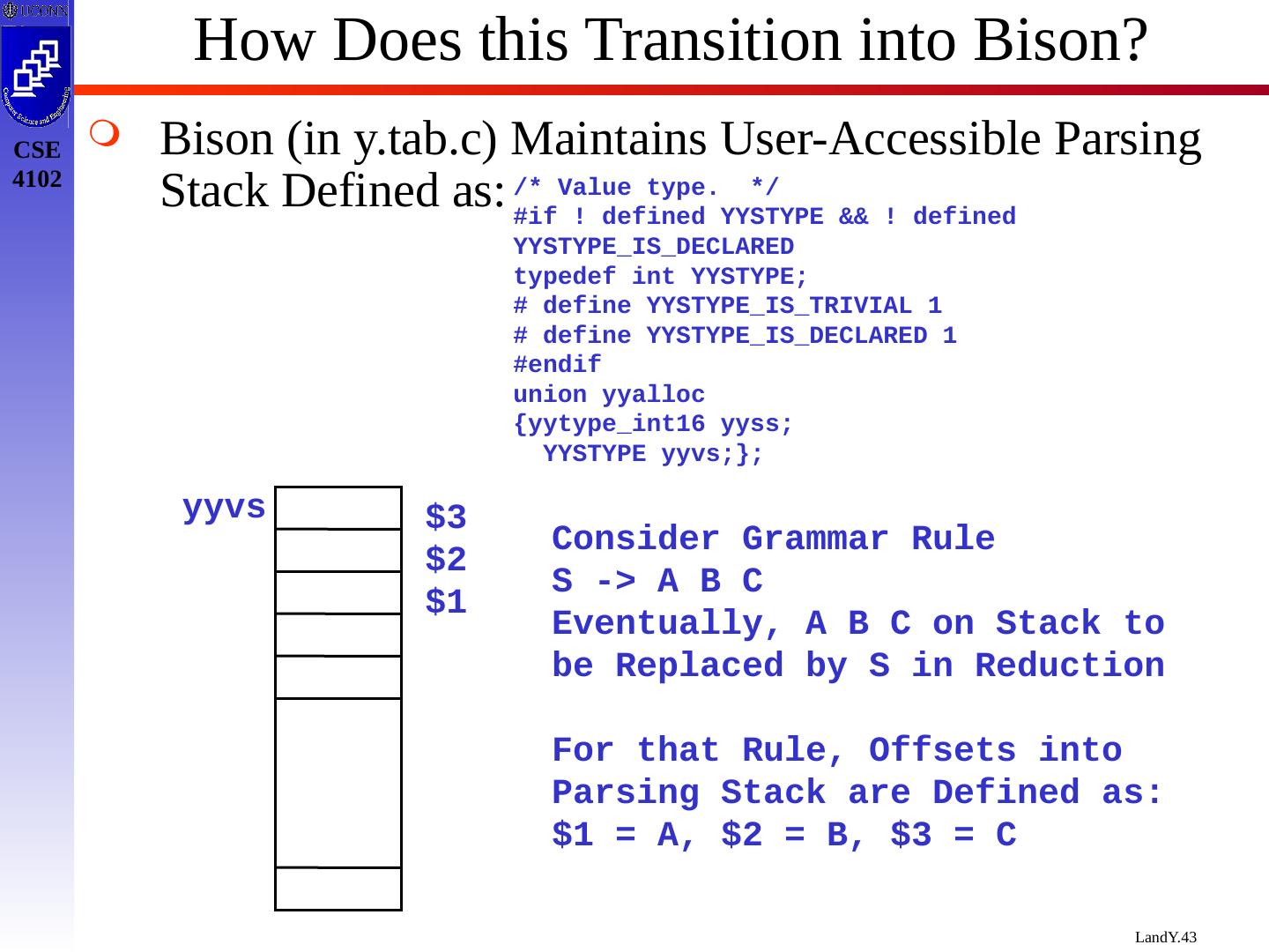 21 .Bison Compiler Writing Tool that Generates LALR(1) Parser Grammar Rules (BNF) can be Modified/Augmented with Semantic Actions via Code Segments Can work in Conjunction with Lex or Separately Three Major Parts of a Bison Specification: Declarations %% Grammar Rules %% User Supplied Programs