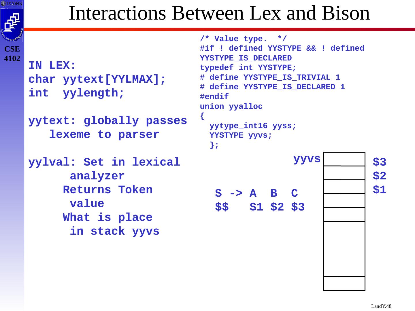 22 .Bison Compiler Writing Tool that Generates LALR(1) Parser Grammar Rules (BNF) can be Modified/Augmented with Semantic Actions via Code Segments Can work in Conjunction with Lex or Separately Three Major Parts of a Bison Specification: Declarations %% Grammar Rules %% User Supplied Programs