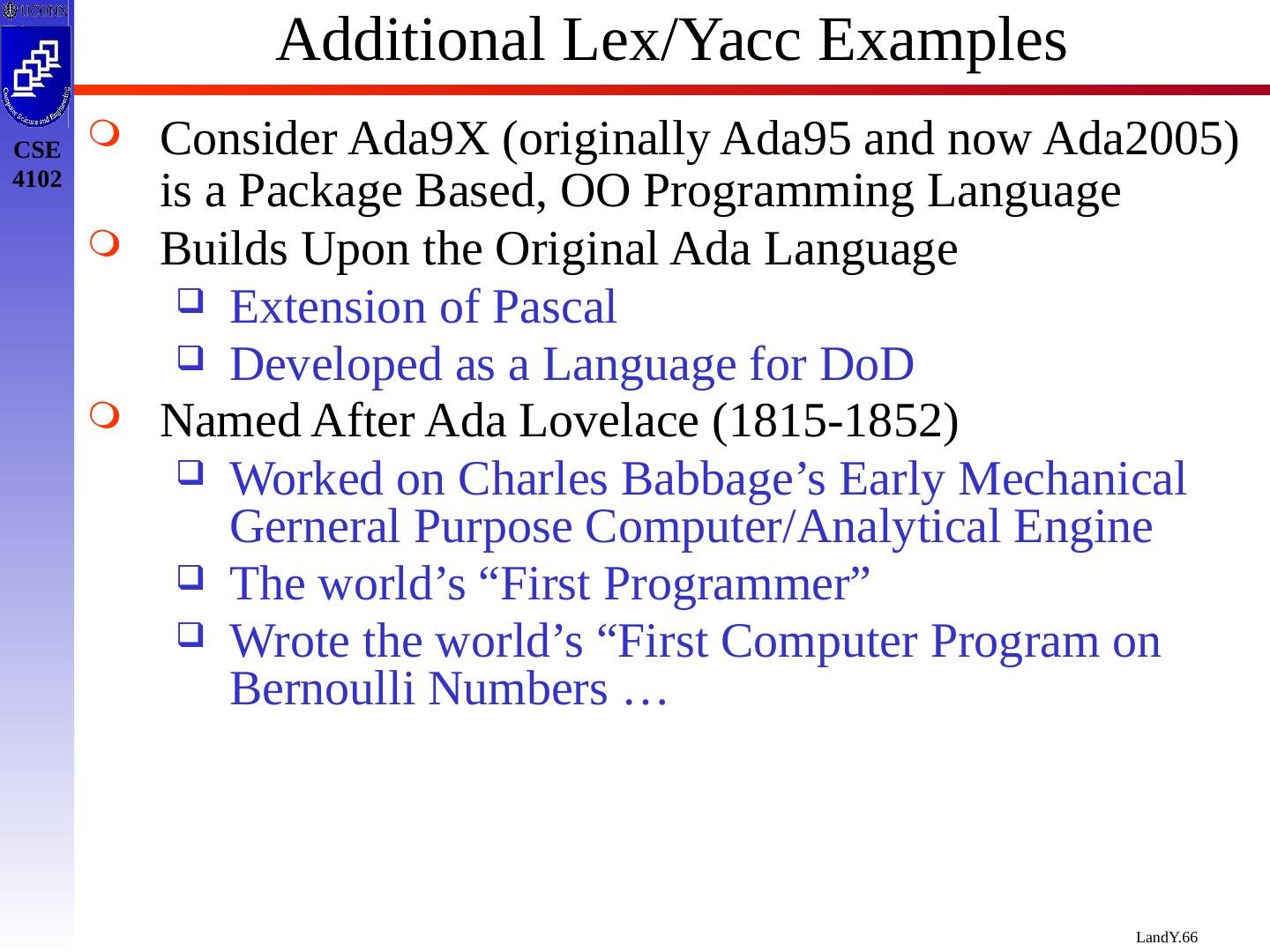 19 .Yacc - Yet Another Compiler Compiler https://www.slideshare.net/kinnarshah8888/ch4c Also from early 1970s A Compiler that Takes as Source a Specification for: Organization of Tokens into Grammar Rules Generates a LALR(1) Parser Pictorially:
