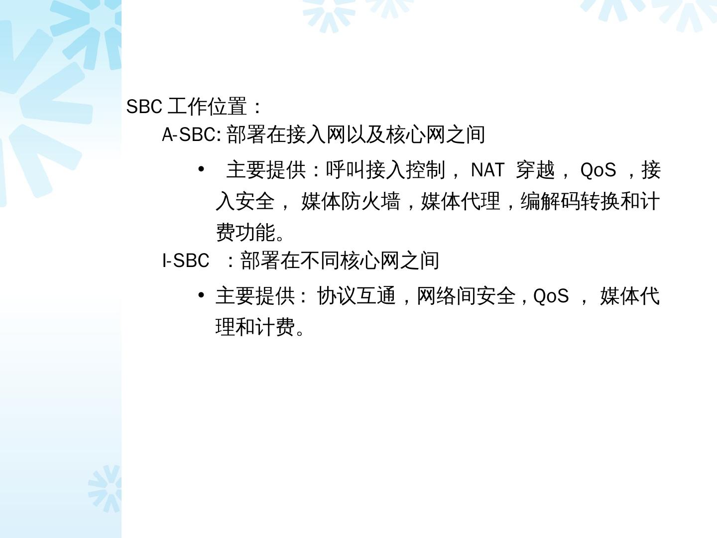 6 .SBC 工作位置: A-SBC: 部署在接入网以及核心网之间 主要提供:呼叫接入控制, NAT 穿越, QoS ,接入安全, 媒体防火墙,媒体代理,编解码转换和计费功能。 I-SBC :部署在不同核心网之间 主要提供 : 协议互通,网络间安全 , QoS , 媒体代理和计费。