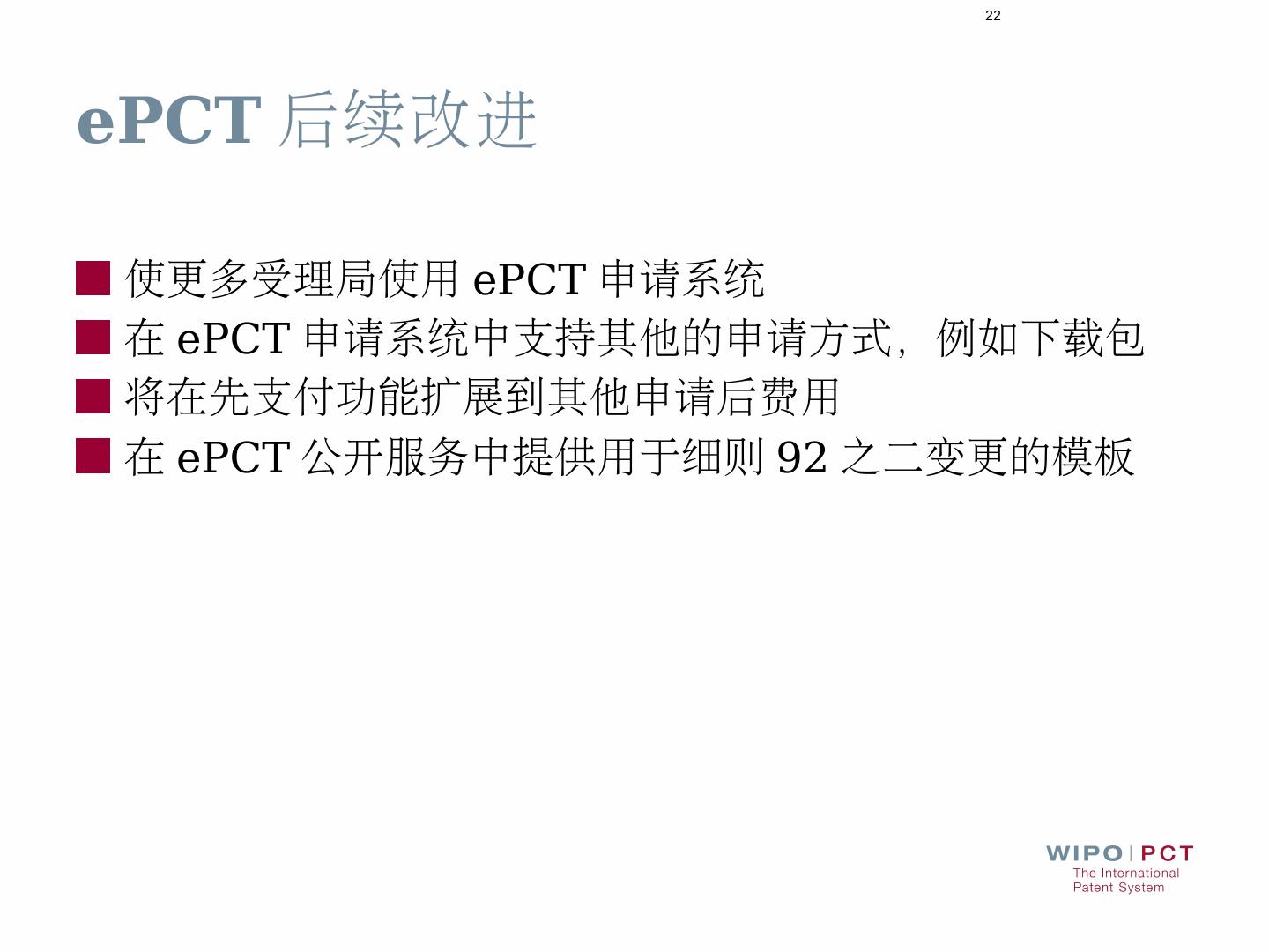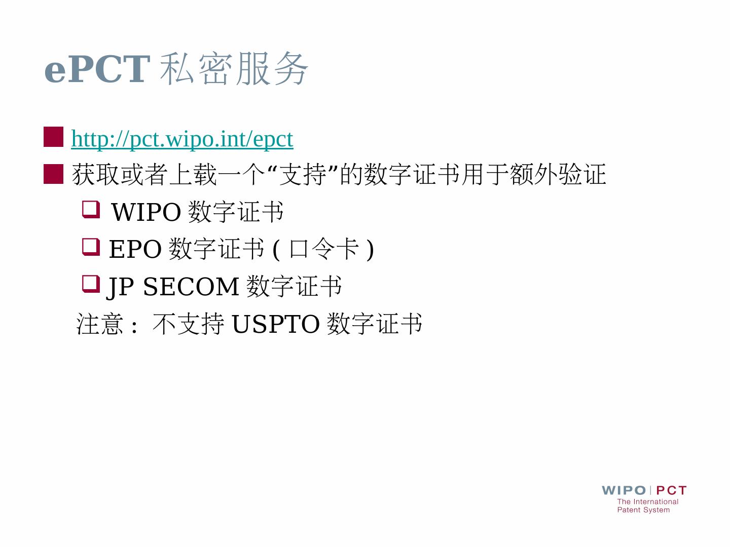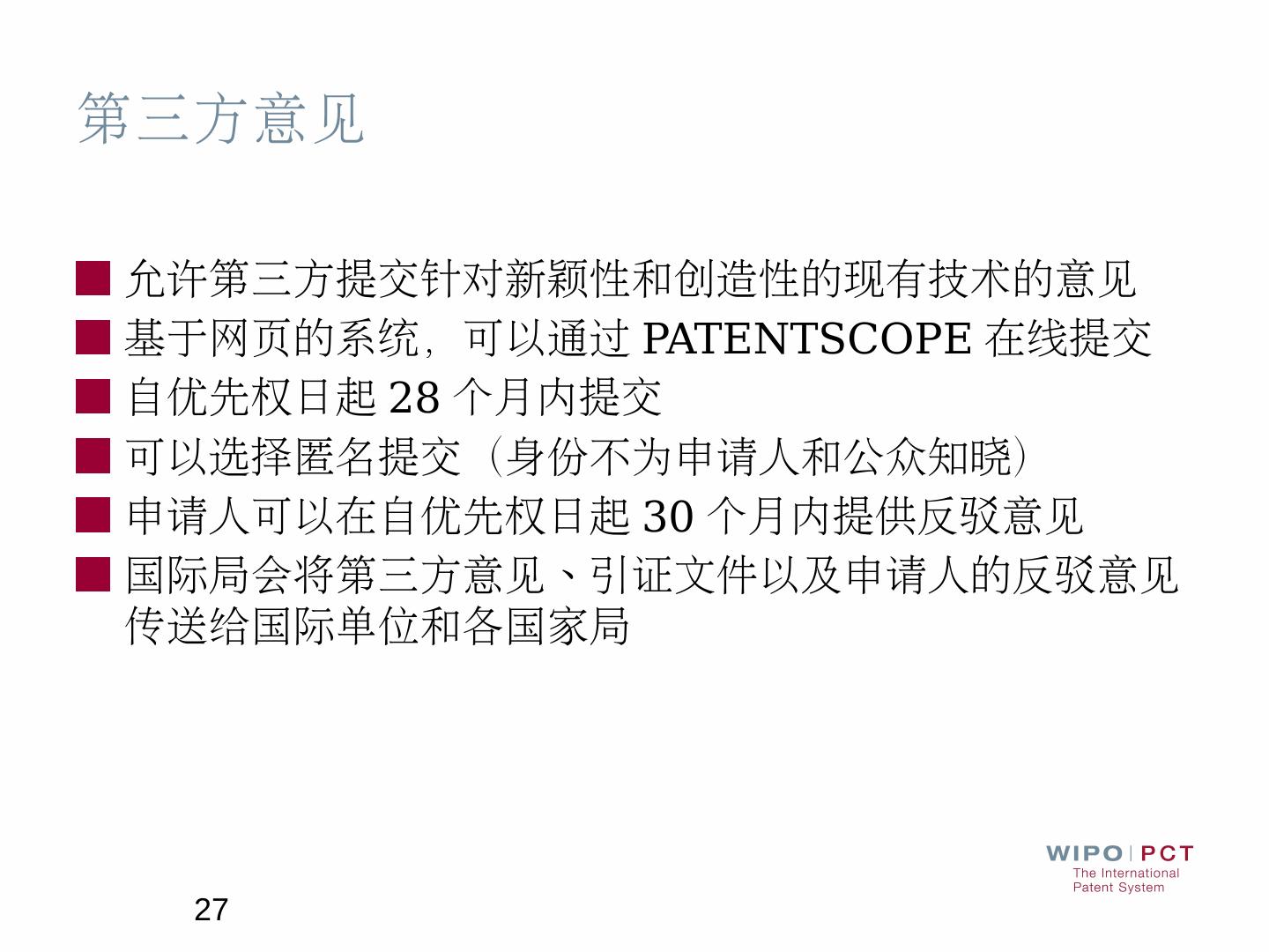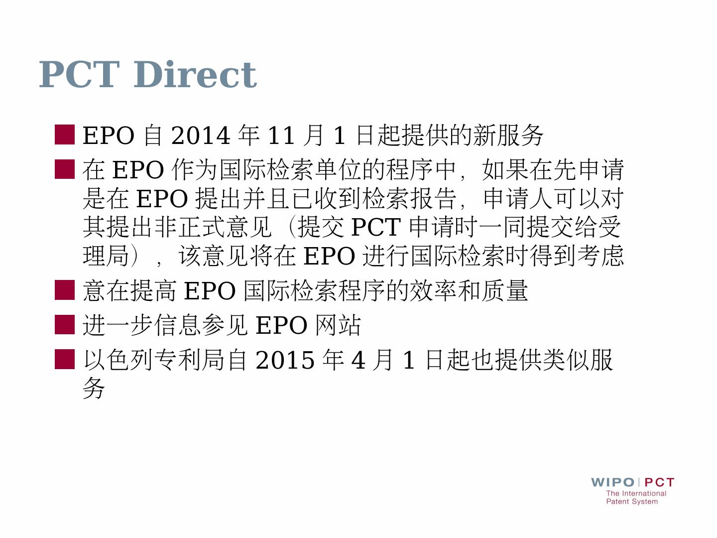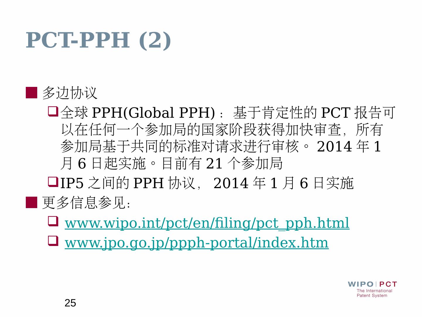 ... 接受语言:英文和中文; 检索文献范围:PCT最低限度范围以及至少所收藏的英文 .... www.wipo.int/pct/en/filing/pct_pph.html · www.jpo.go.jp/ppph-portal/index.htm.