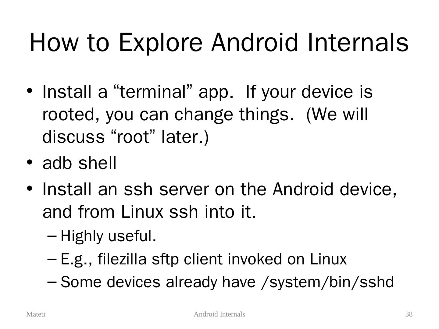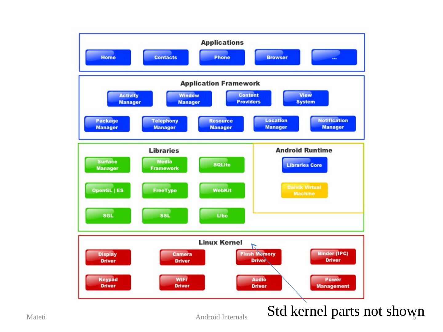 Std kernel parts not shown. Android Internals. Linux OS Inside. Linux Kernel Works as a HAL; Linux/Android Device drivers; Linux Memory management; Linux ...