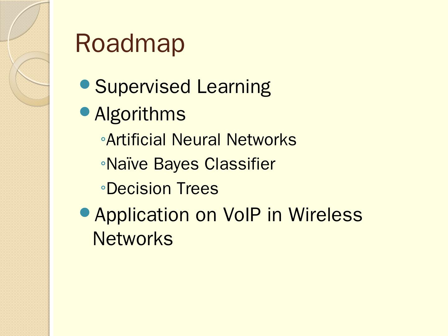 Artificial Neural Networks. Naïve Bayes Classifier; Decision Trees. Application on VoIP in Wireless Networks. Machine Learning. The study of algorithms and ...