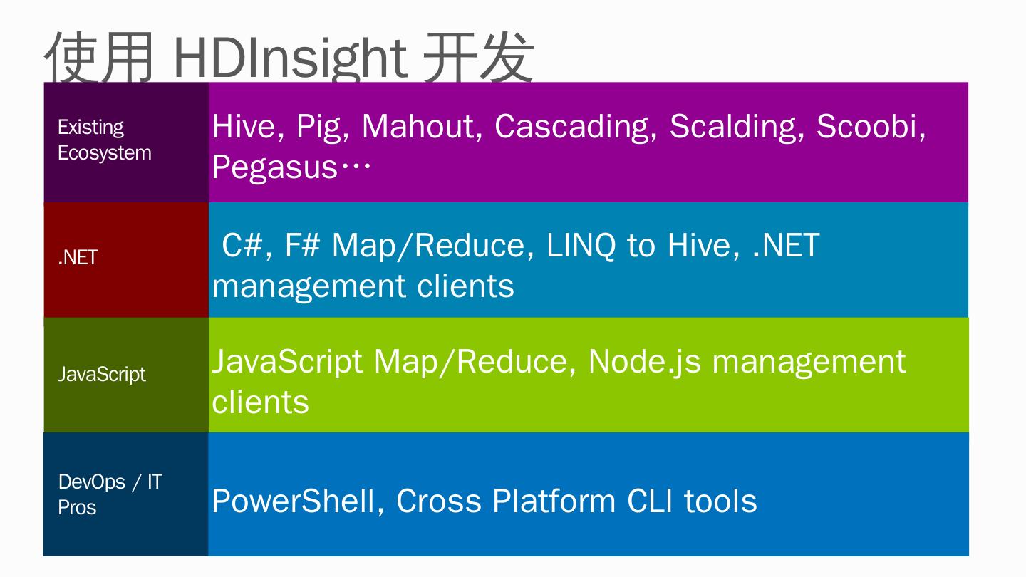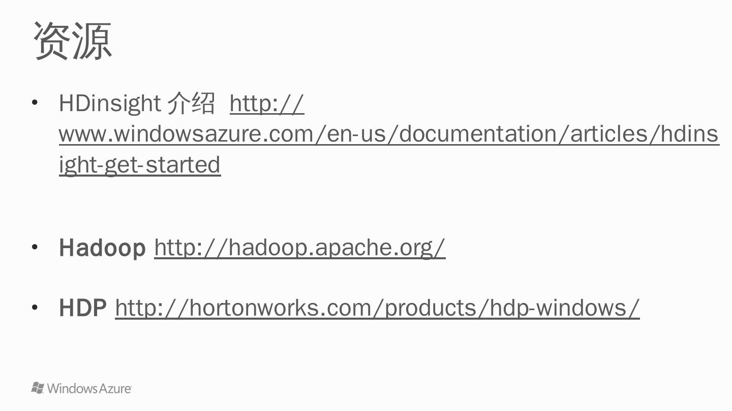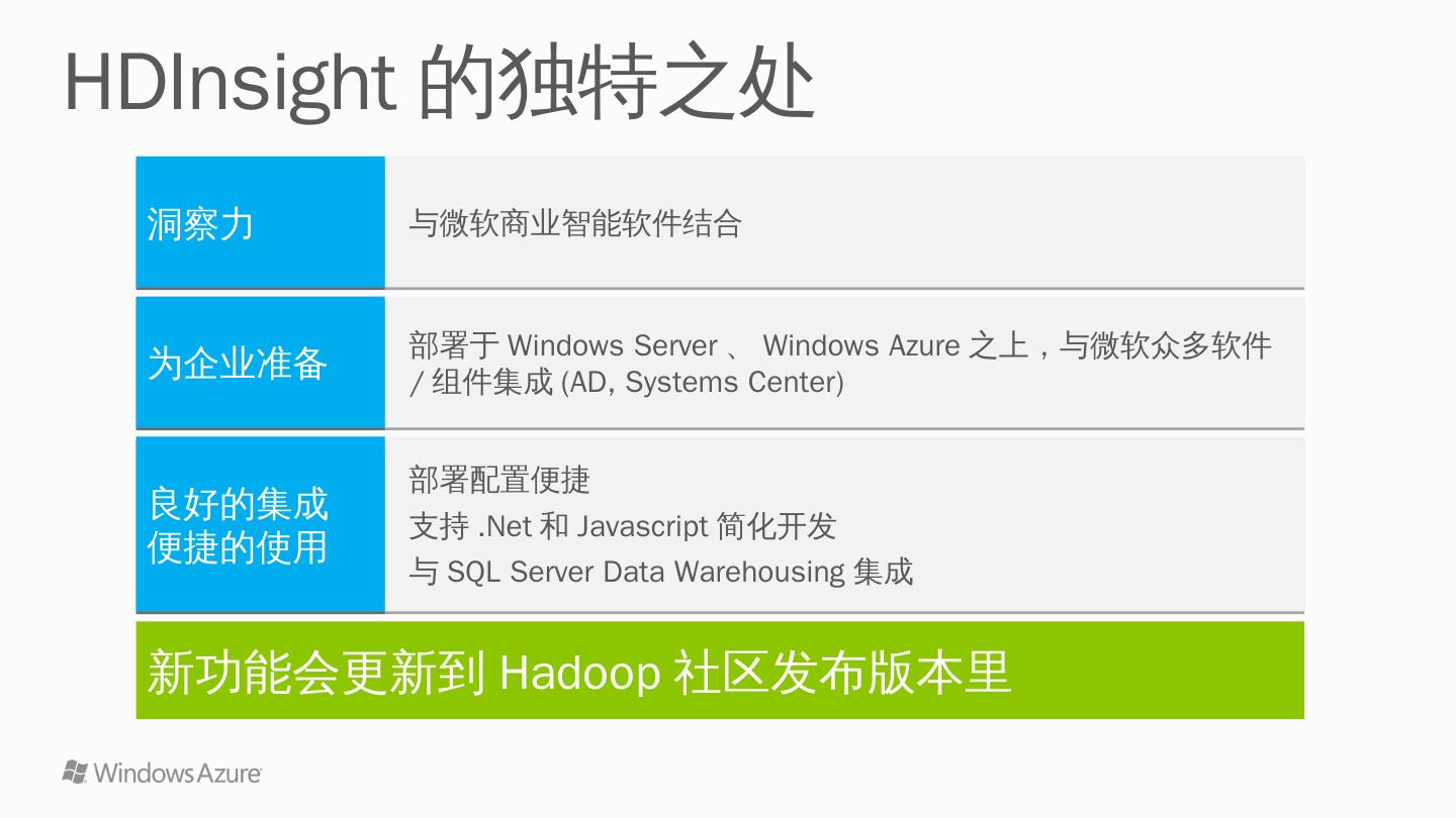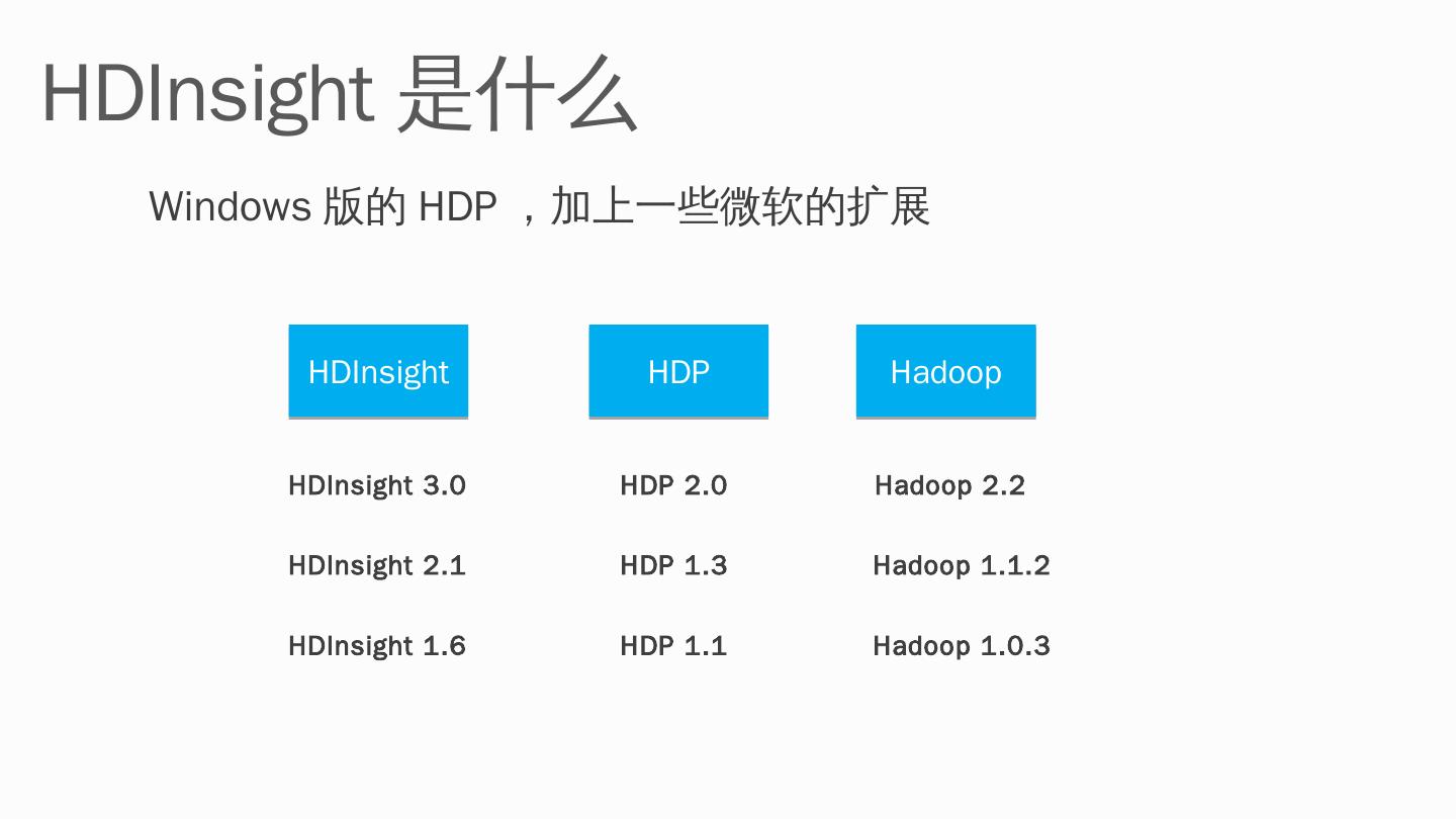 HDInsight: Windows Azure + Hadoop ... Hadoop. HDInsight 3.0. HDP 2.0. Hadoop 2.2. HDInsight 2.1. HDP 1.3. Hadoop 1.1. ... 提交Hadoop/Pig/ Hive/Sqoop任务.