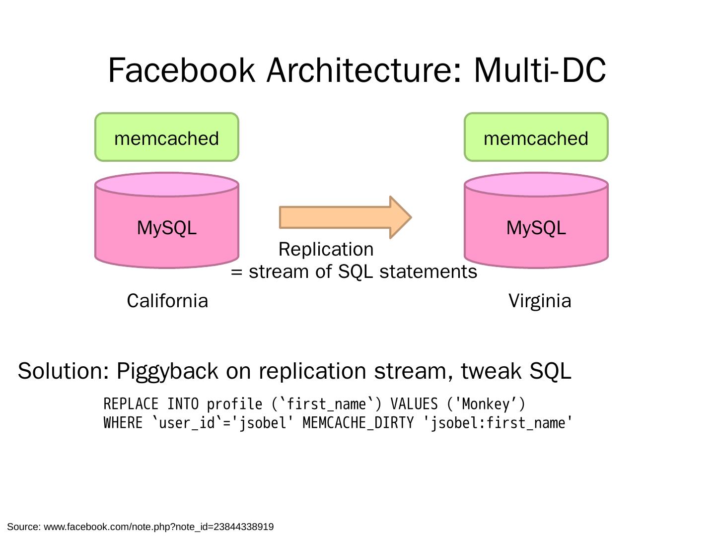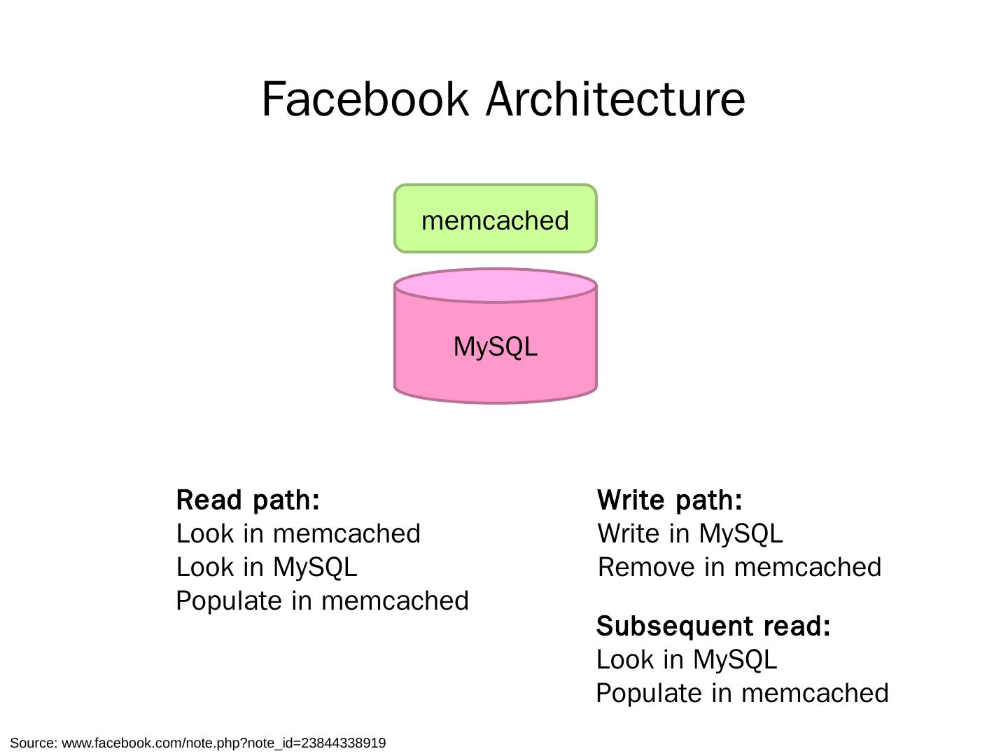 memcached. Read path: Look in memcached. Look in MySQL. Populate in memcached. Write path: Write in MySQL. Remove in memcached. Subsequent read:.