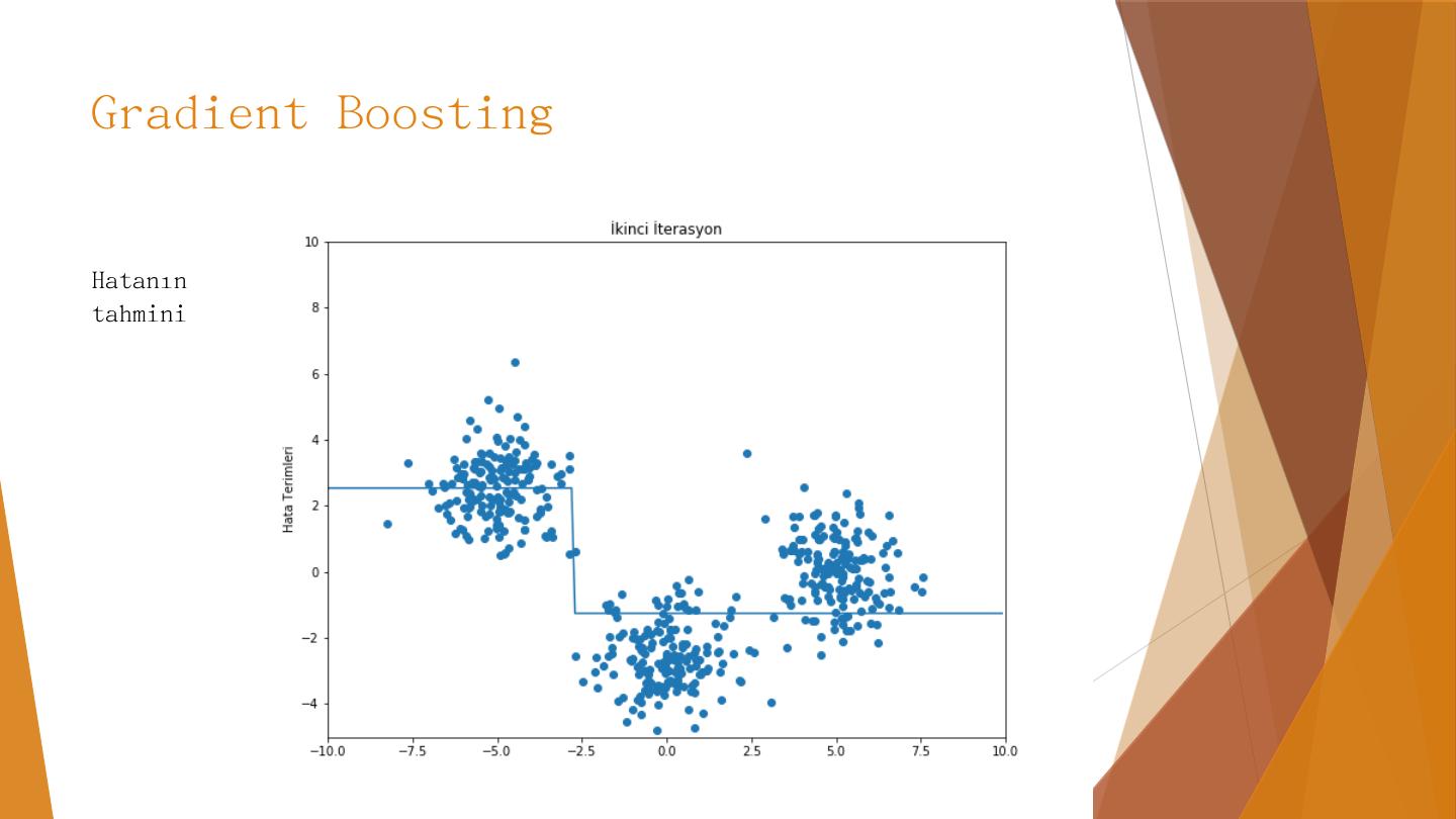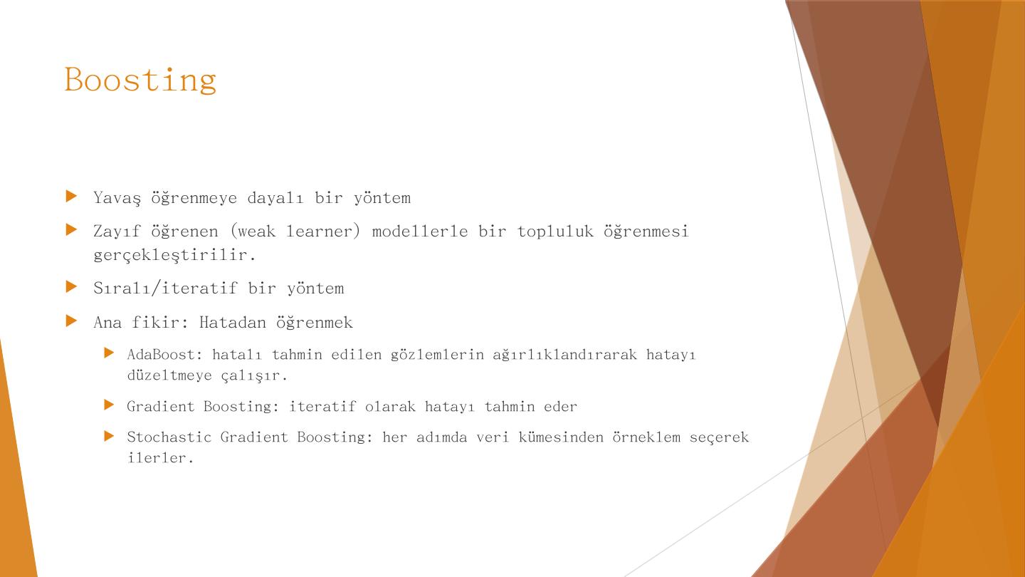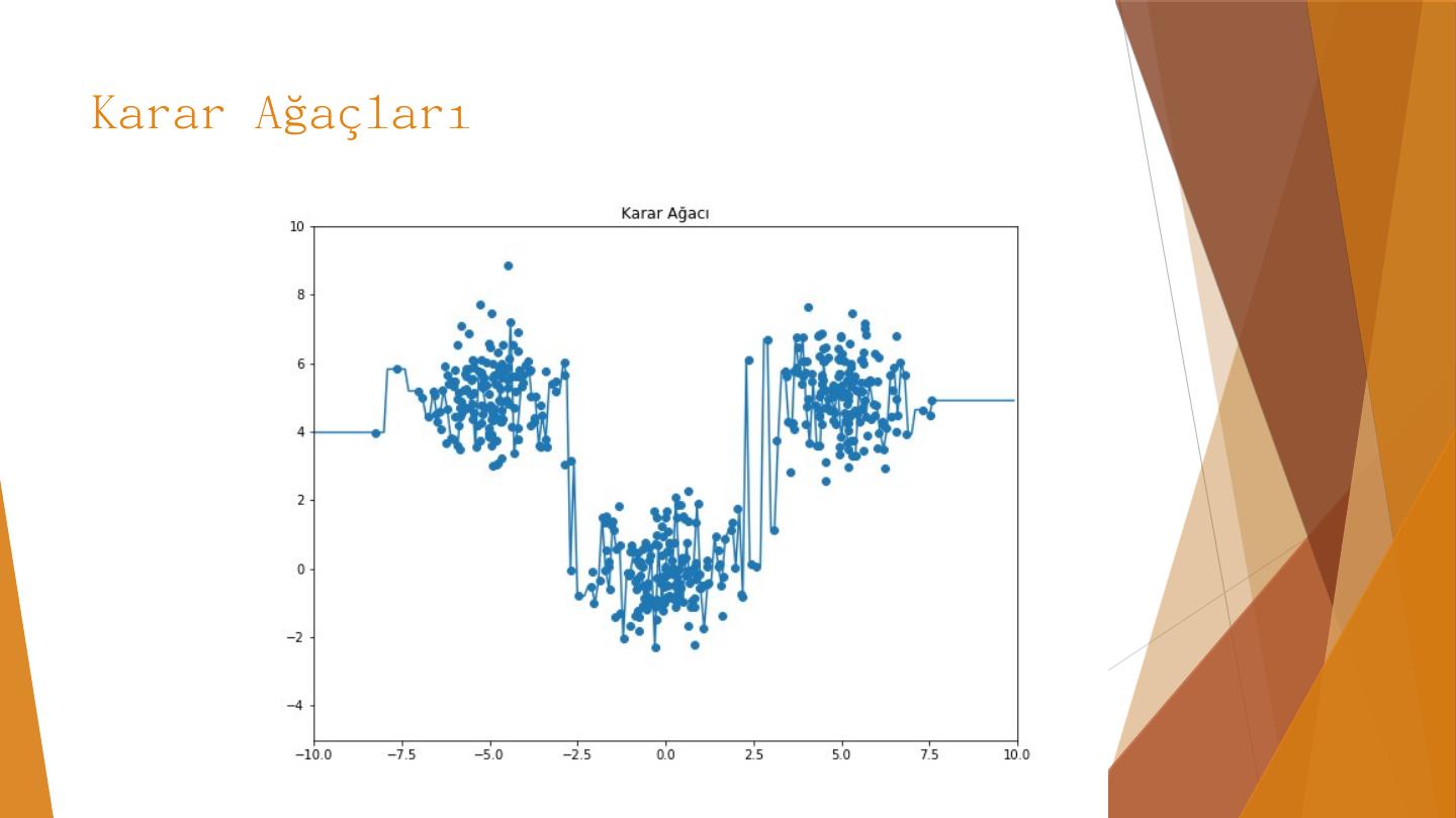 AdaBoost. Calibration. Gradient Boosting. Karar Ağaçları. Özniteliklerin değerlerine göre yapılan kırılımlarla birbirine benzeyen örnekleri ayrıştırmaya dayanır.