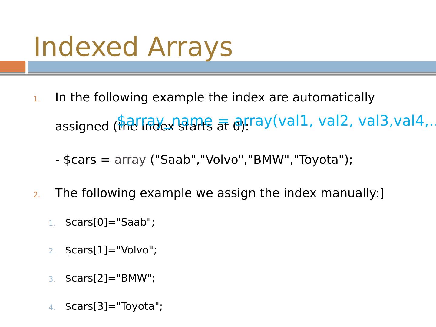 8 .Indexed Arrays In the following example the index are automatically assigned (the index starts at 0 ): - $cars = array (" Saab","Volvo","BMW","Toyota "); The following example we assign the index manually :] $ cars[0]="Saab "; $ cars[1]="Volvo "; $ cars[2]="BMW "; $ cars[3]="Toyota"; $ array_name = array(val1, val2, val3,val4 ,……);