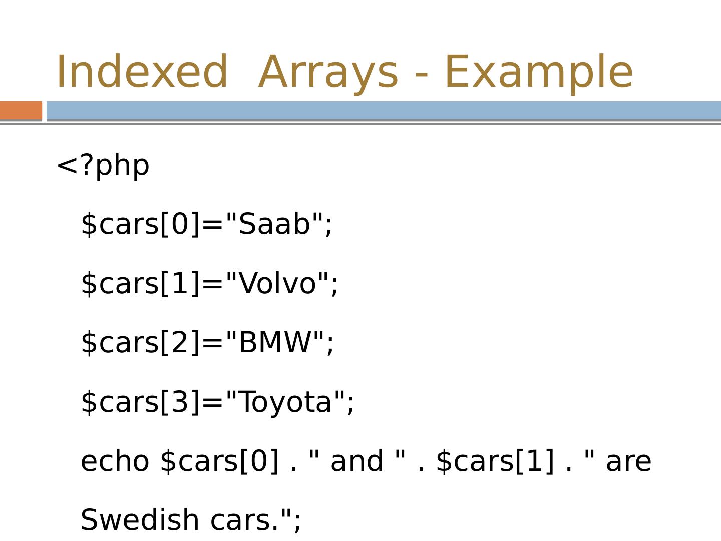 9 .Indexed Arrays - Example <? php $cars[0]="Saab"; $cars[1]="Volvo"; $cars[2]="BMW"; $cars[3]="Toyota"; echo $cars[0] . " and " . $cars[1] . " are Swedish cars."; ?>