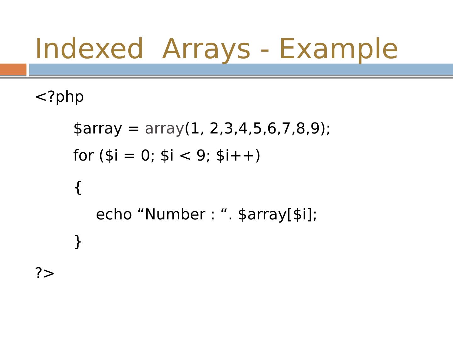10 .Indexed Arrays - Example <? php $array = array (1, 2,3,4,5,6,7,8,9); for ($ i = 0; $ i < 9; $ i ++) { echo “Number : “. $array[$ i ]; } ?>