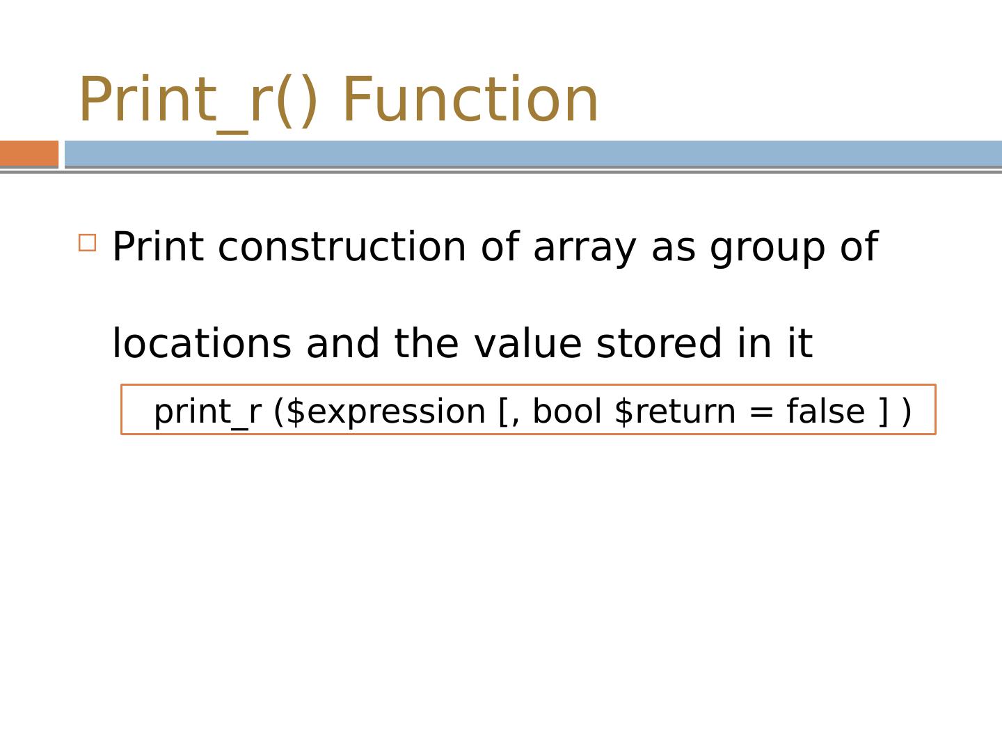 11 .Print_r () Function Print construction of array as group of locations and the value stored in it print_r ($ expression [, bool $return = false ] )