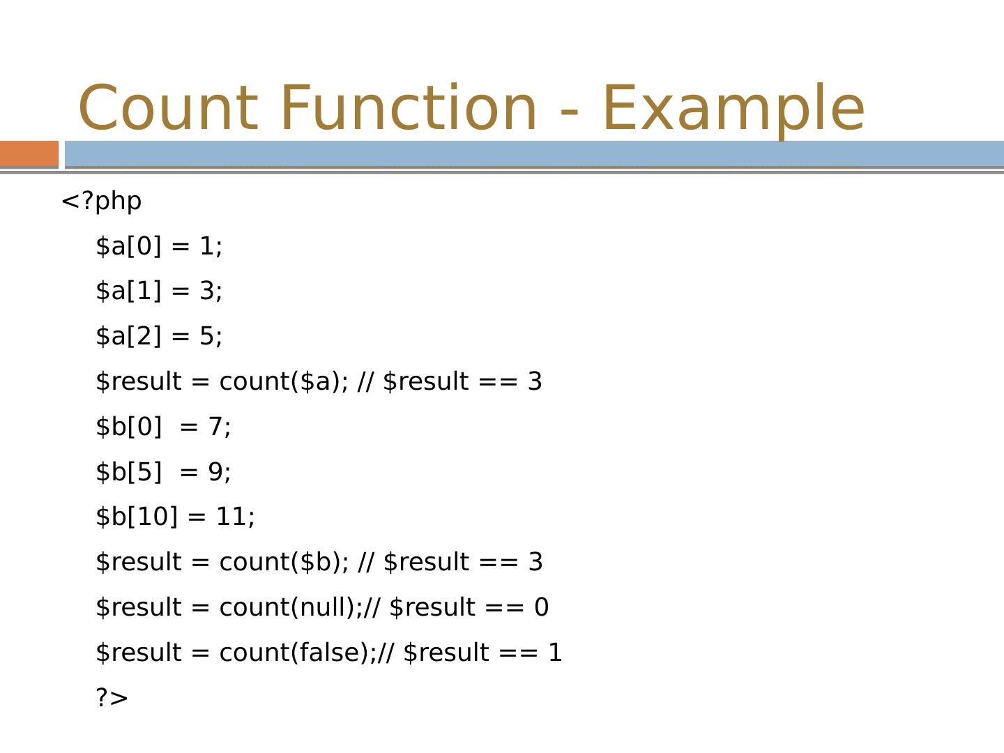 14 .Count Function - Example <? php $a[0] = 1; $a[1] = 3; $a[2] = 5; $result = count($a ); // $result == 3 $b[0] = 7; $b[5] = 9; $b[10] = 11; $result = count($b ); // $result == 3 $result = count(null );// $result == 0 $result = count(false );// $result == 1 ?>