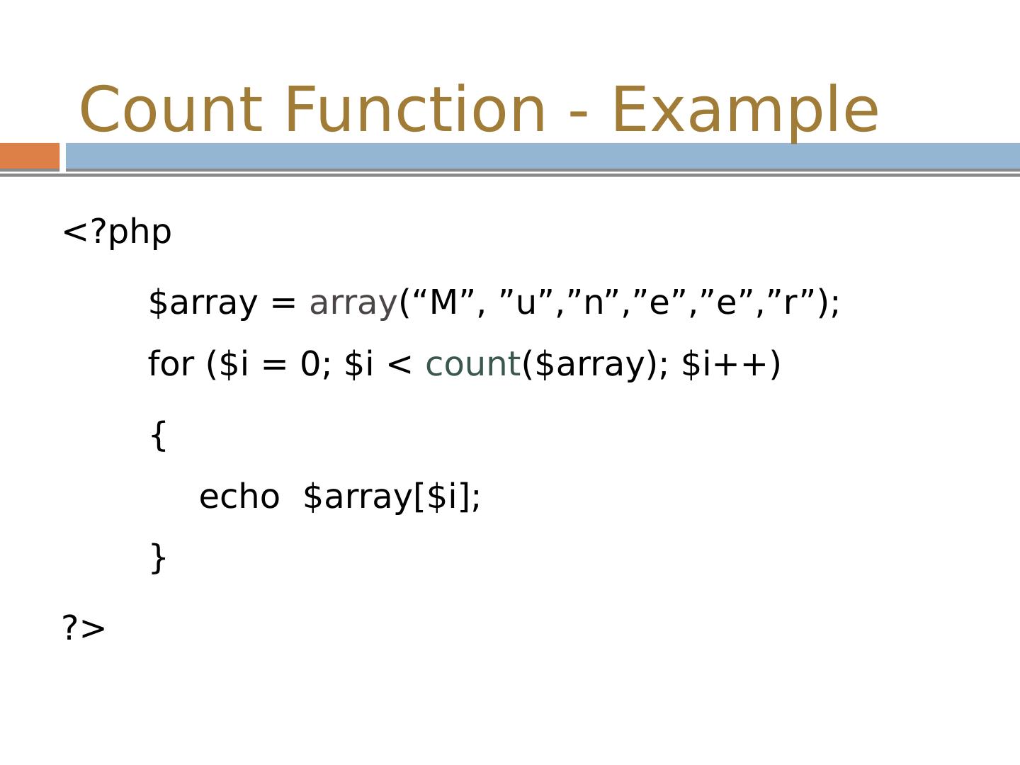 16 .Count Function - Example <? php $array = array (“M”, ” u”,”n”,”e”,”e”,”r ”); for ($ i = 0; $ i < count ($array); $ i ++) { echo $array[$ i ]; } ?>