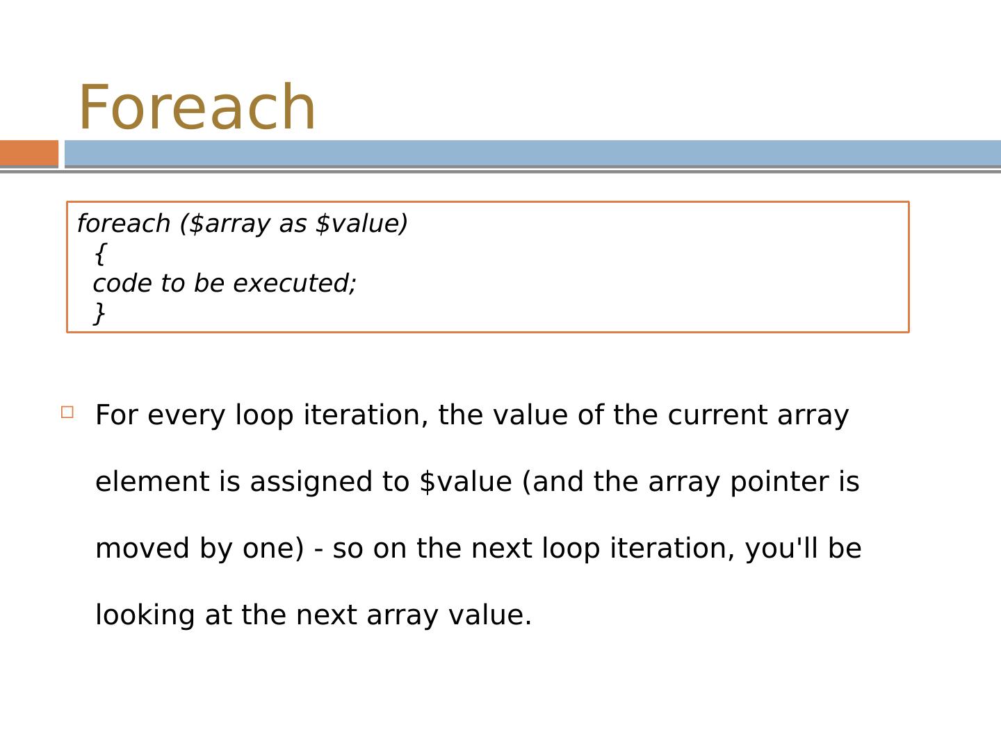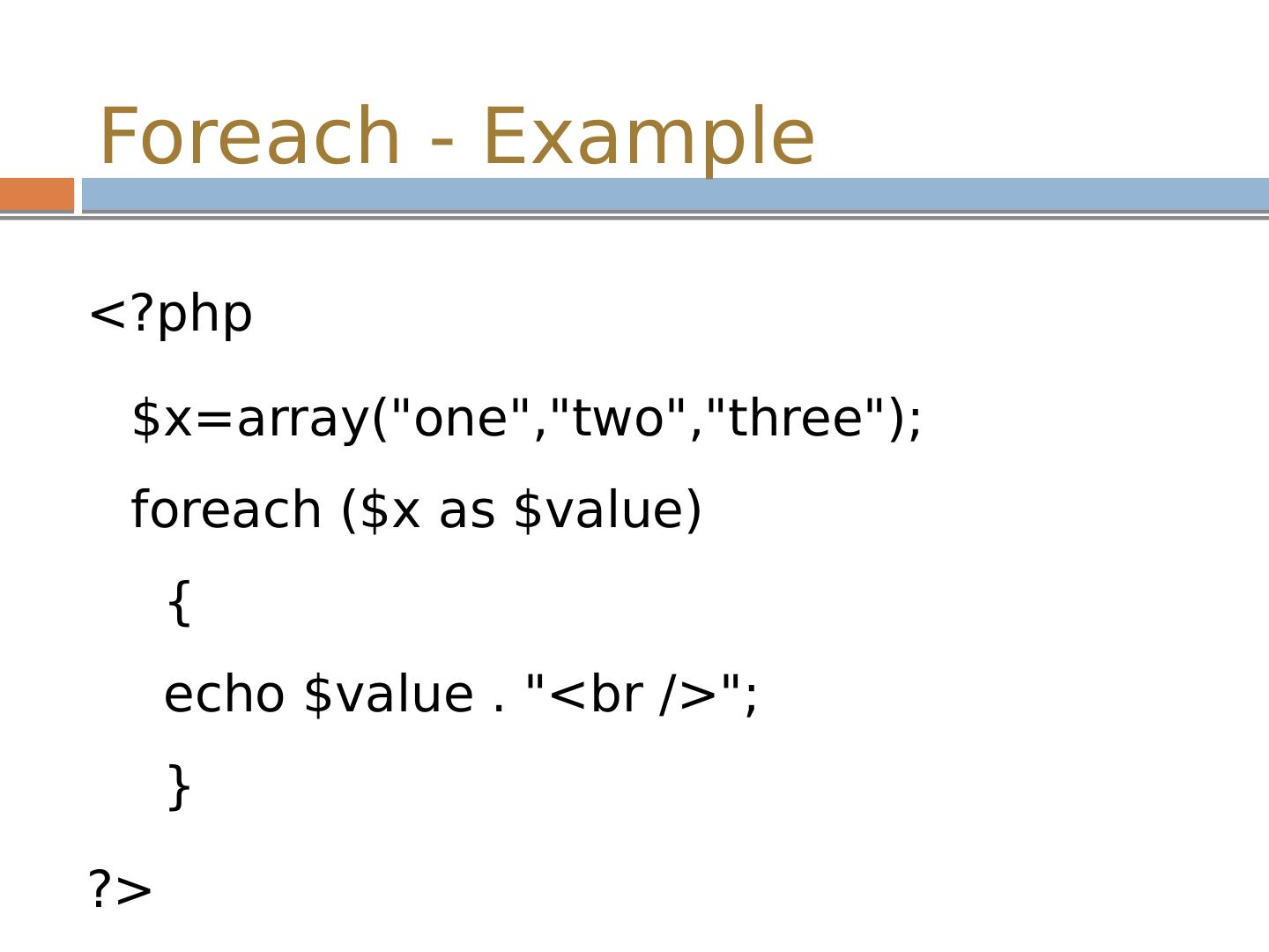 17 .Foreach - Example <? php $x=array(" one","two","three "); foreach ($x as $value) { echo $value . "< br />"; } ?>