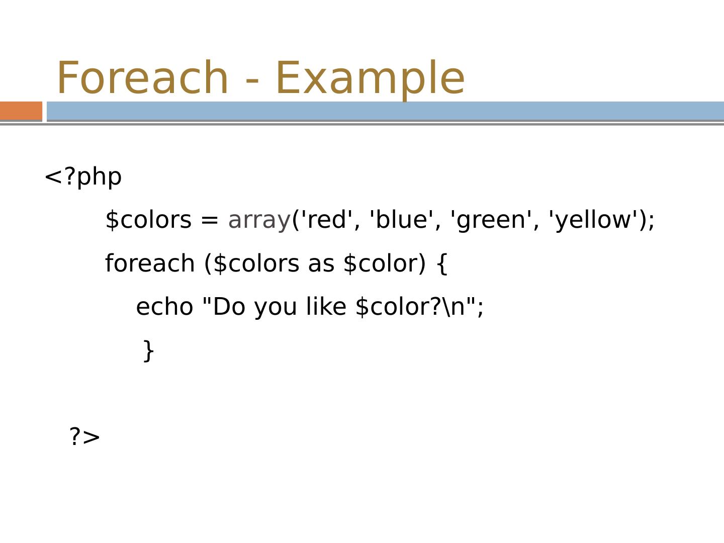 18 .Foreach - Example <? php $colors = array (red, blue, green, yellow); foreach ($colors as $color) { echo "Do you like $color?