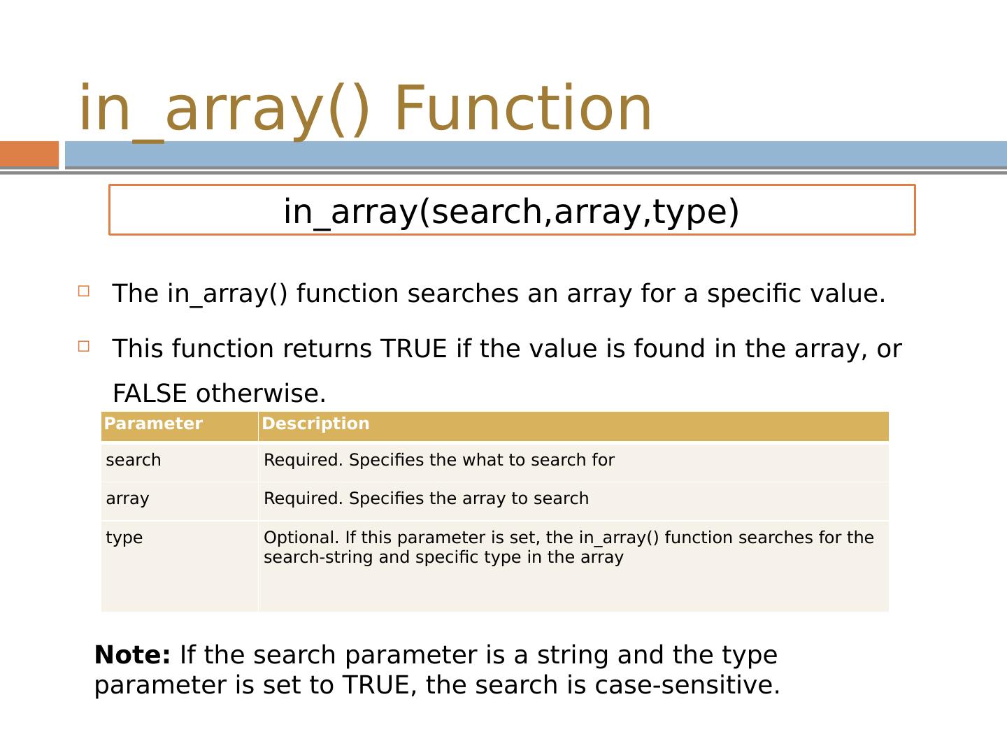 19 .in_array () Function The in_array () function searches an array for a specific value . This function returns TRUE if the value is found in the array, or FALSE otherwise. in_array ( search,array,type ) Parameter Description search Required. Specifies the what to search for array Required. Specifies the array to search type Optional. If this parameter is set, the in_array () function searches for the search-string and specific type in the array Note : If the search parameter is a string and the type parameter is set to TRUE, the search is case-sensitive.