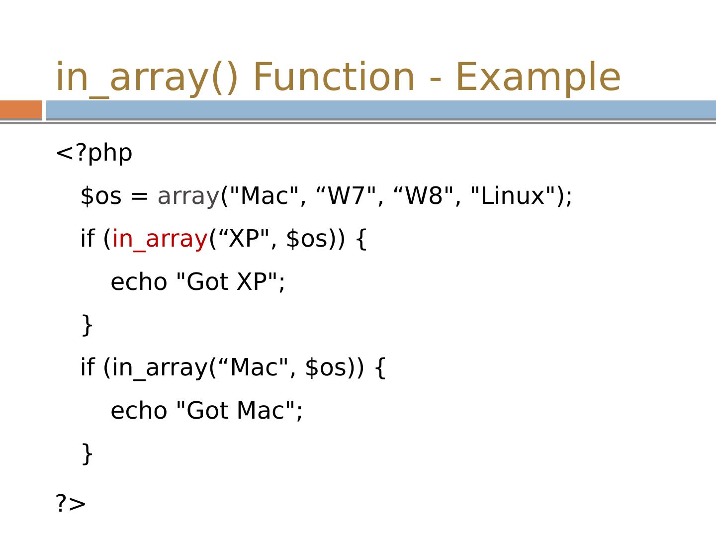 20 .in_array () Function - Example <? php $ os = array ("Mac", “W7", “W8", "Linux"); if ( in_array (“XP", $ os )) { echo "Got XP"; } if ( in_array (“Mac", $ os )) { echo "Got Mac"; } ?>
