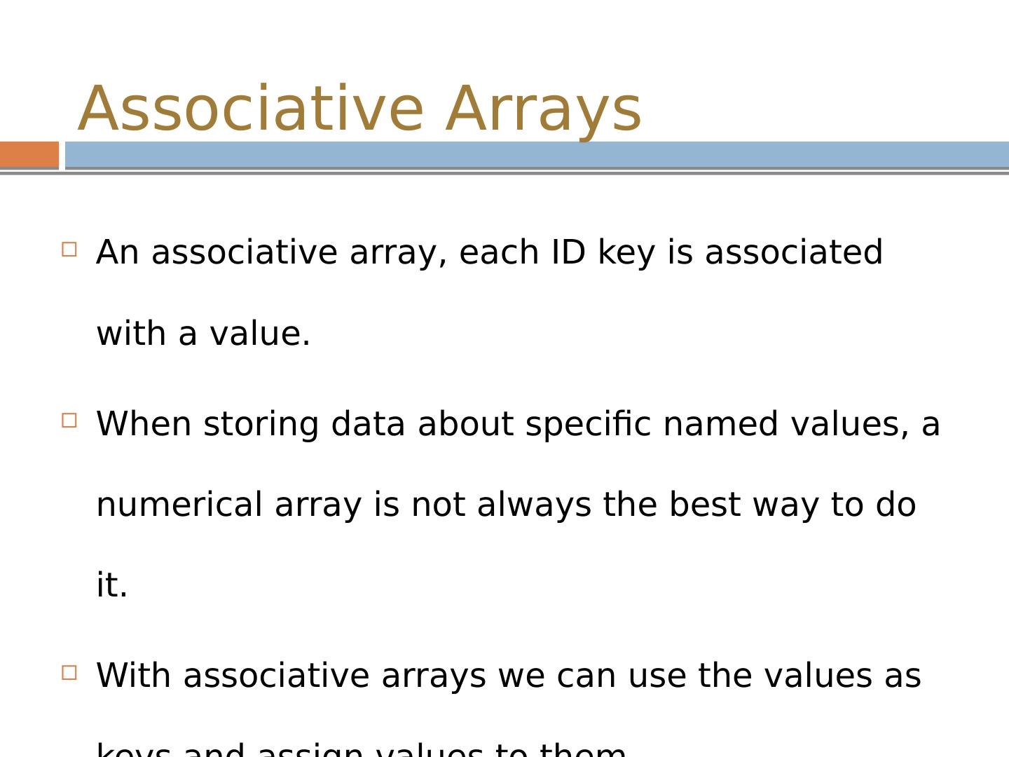 21 .Associative Arrays An associative array, each ID key is associated with a value. When storing data about specific named values, a numerical array is not always the best way to do it. With associative arrays we can use the values as keys and assign values to them.