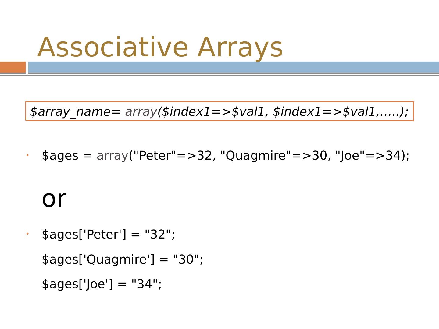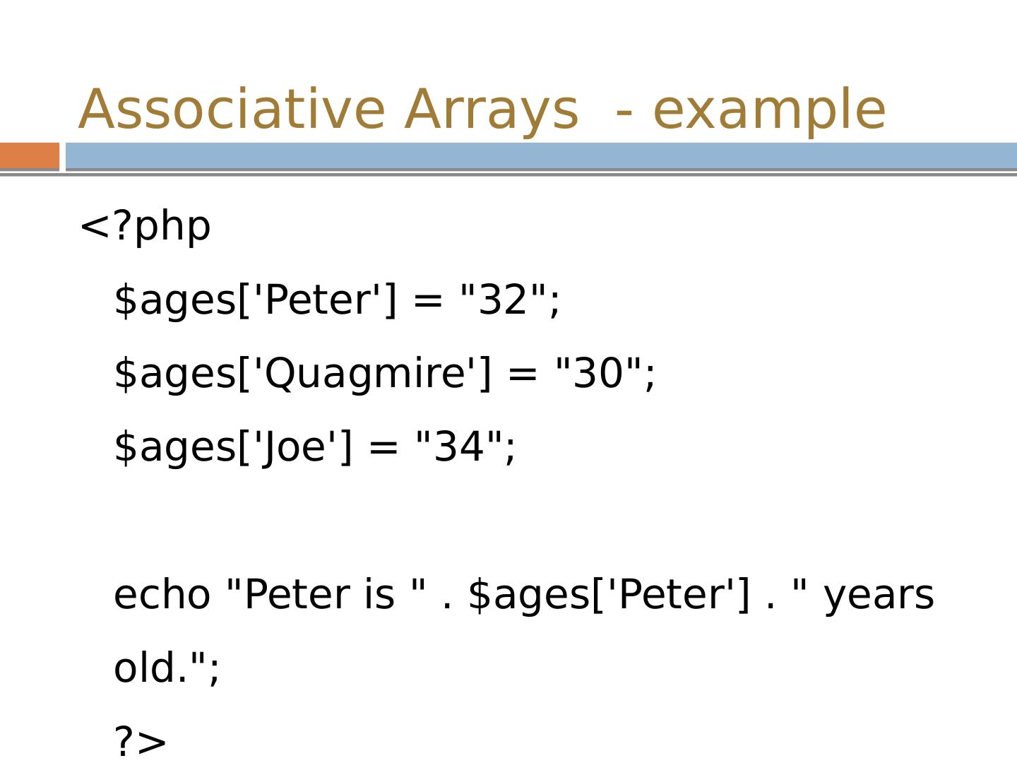 25 .Associative Arrays - example <? php $ages[Peter] = "32"; $ages[Quagmire] = "30"; $ages[Joe] = "34"; echo "Peter is " . $ages[Peter] . " years old."; ?>