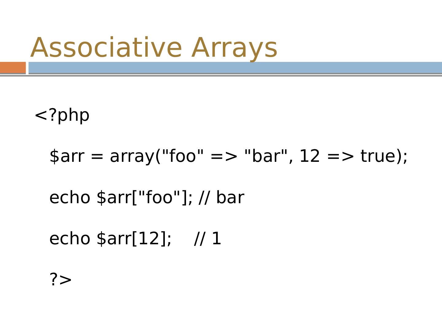 23 .Associative Arrays <? php $ arr = array("foo" => "bar", 12 => true ); echo $ arr ["foo"]; // bar echo $ arr [12]; // 1 ?>