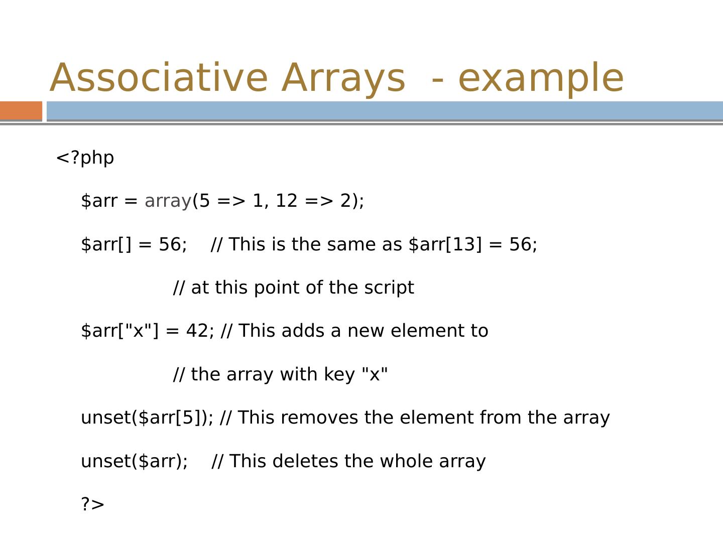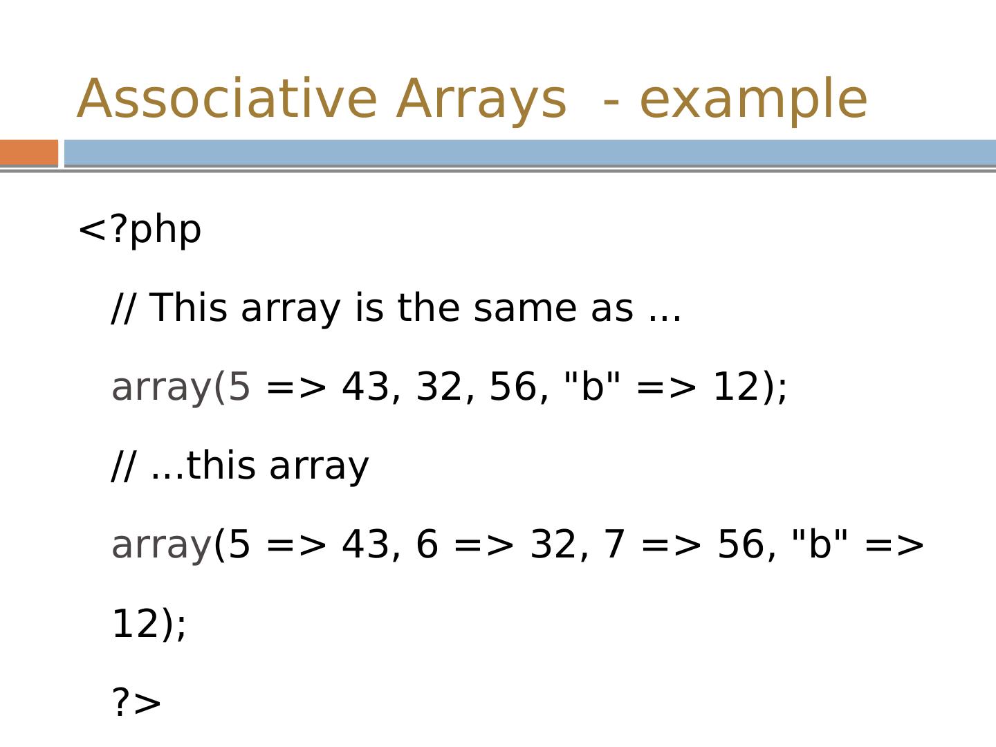 24 .Associative Arrays - example <? php // This array is the same as ... array(5 => 43, 32, 56, "b" => 12); // ...this array array (5 => 43, 6 => 32, 7 => 56, "b" => 12); ?>
