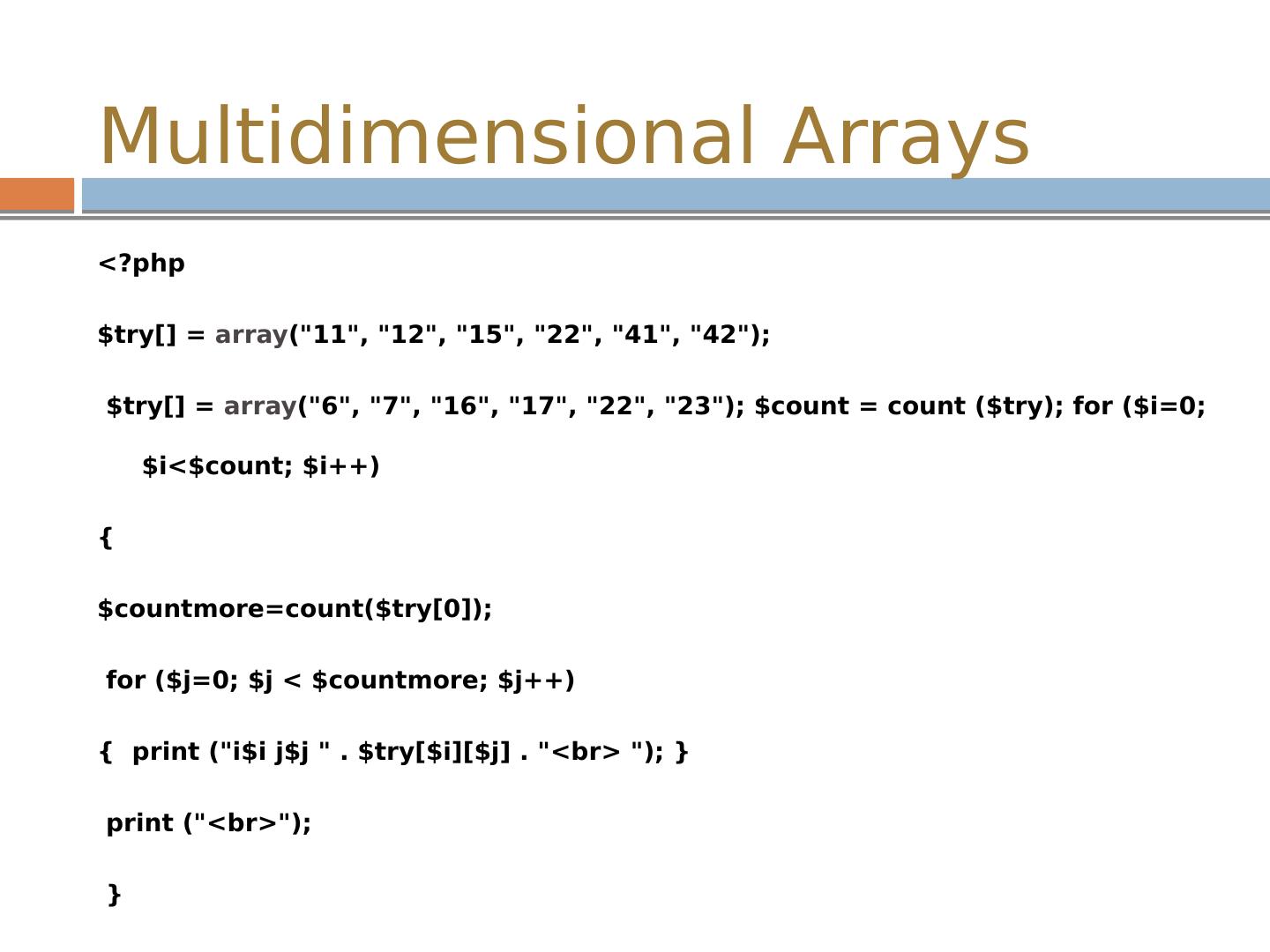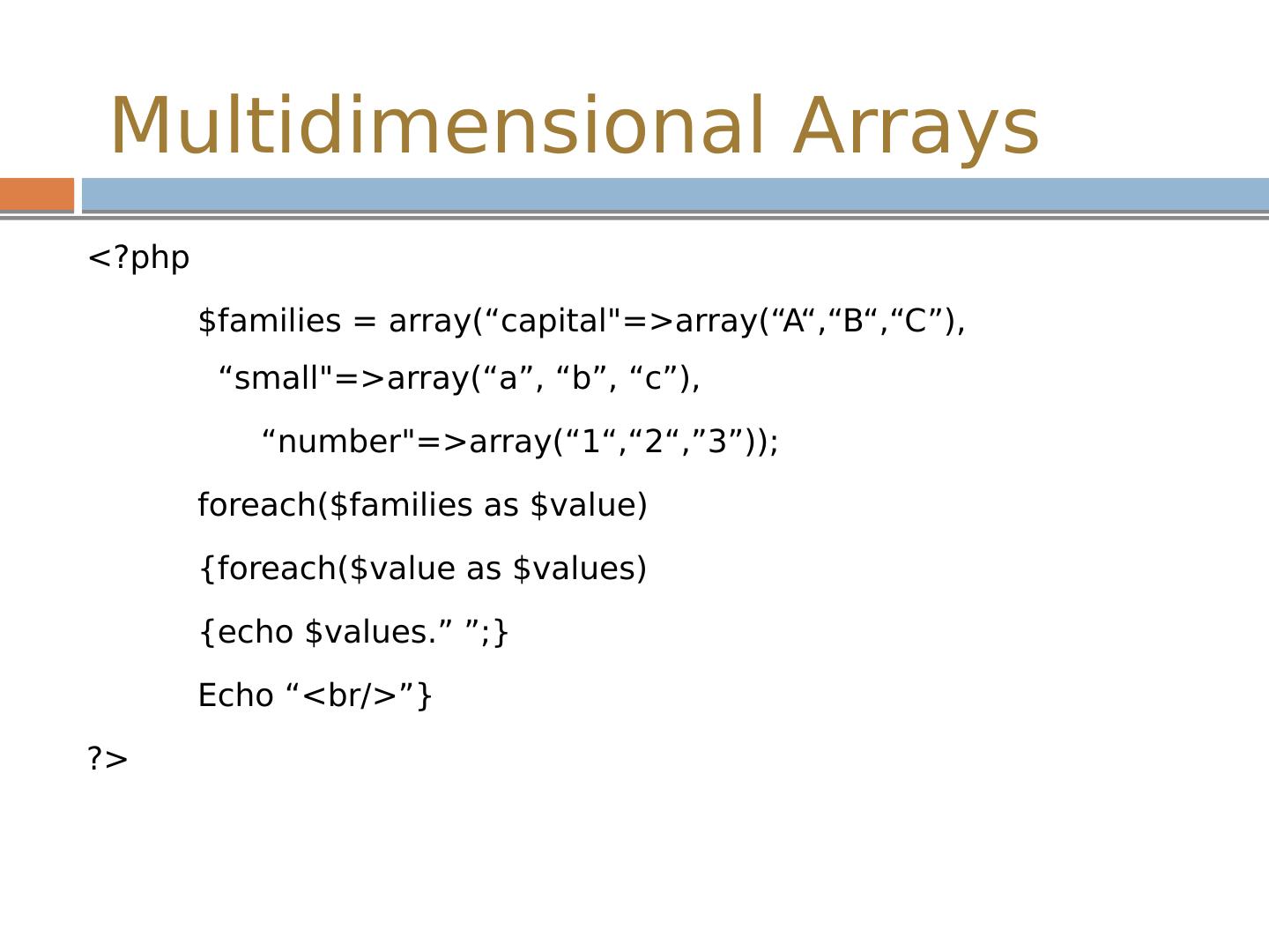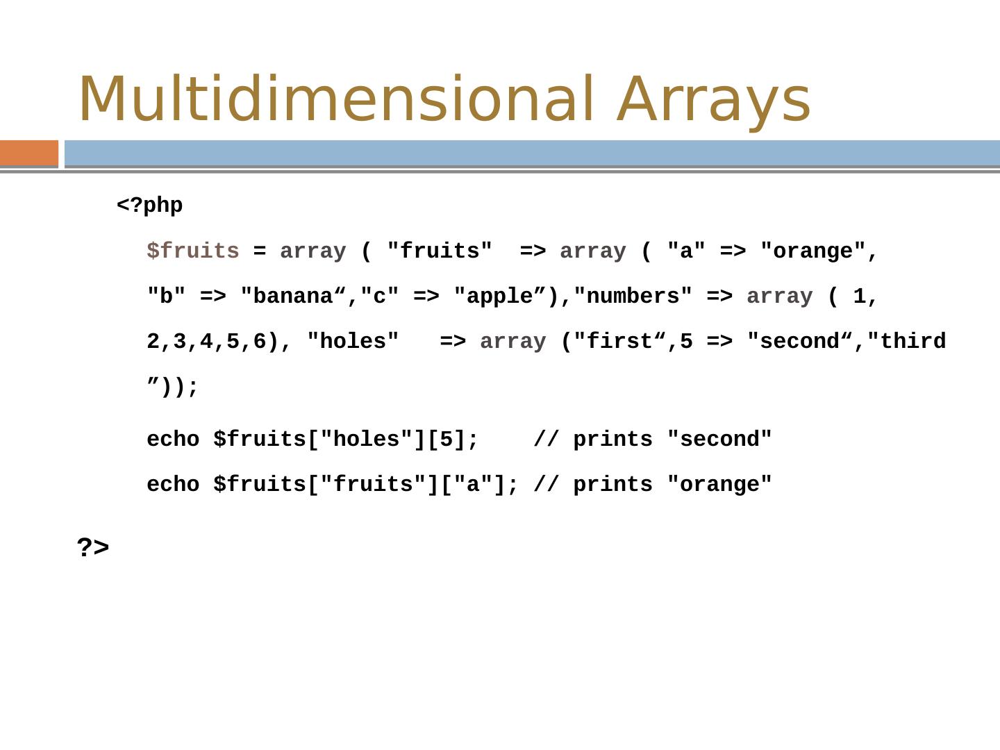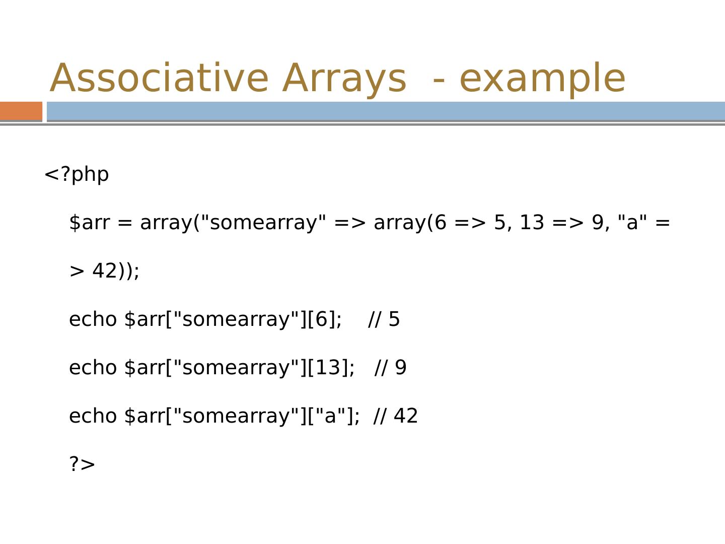 27 .Associative Arrays - example <? php $ arr = array(" somearray " => array(6 => 5, 13 => 9, "a" => 42 )); echo $ arr [" somearray "][6]; // 5 echo $ arr [" somearray "][13]; // 9 echo $ arr [" somearray "]["a"]; // 42 ?>