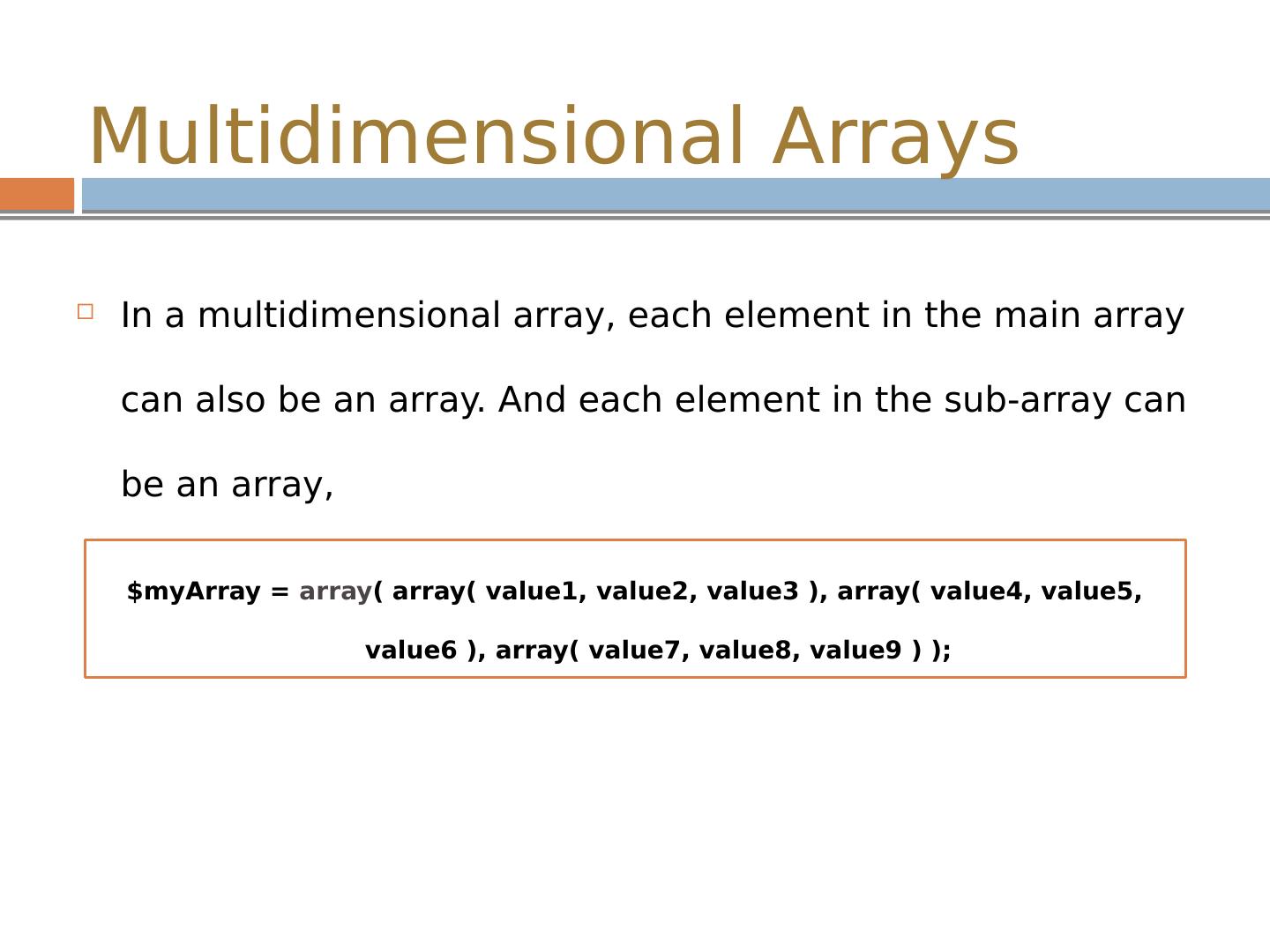 28 .Multidimensional Arrays In a multidimensional array, each element in the main array can also be an array. And each element in the sub-array can be an array, $ myArray = array ( array( value1, value2, value3 ), array( value4, value5, value6 ), array( value7, value8, value9 ) );