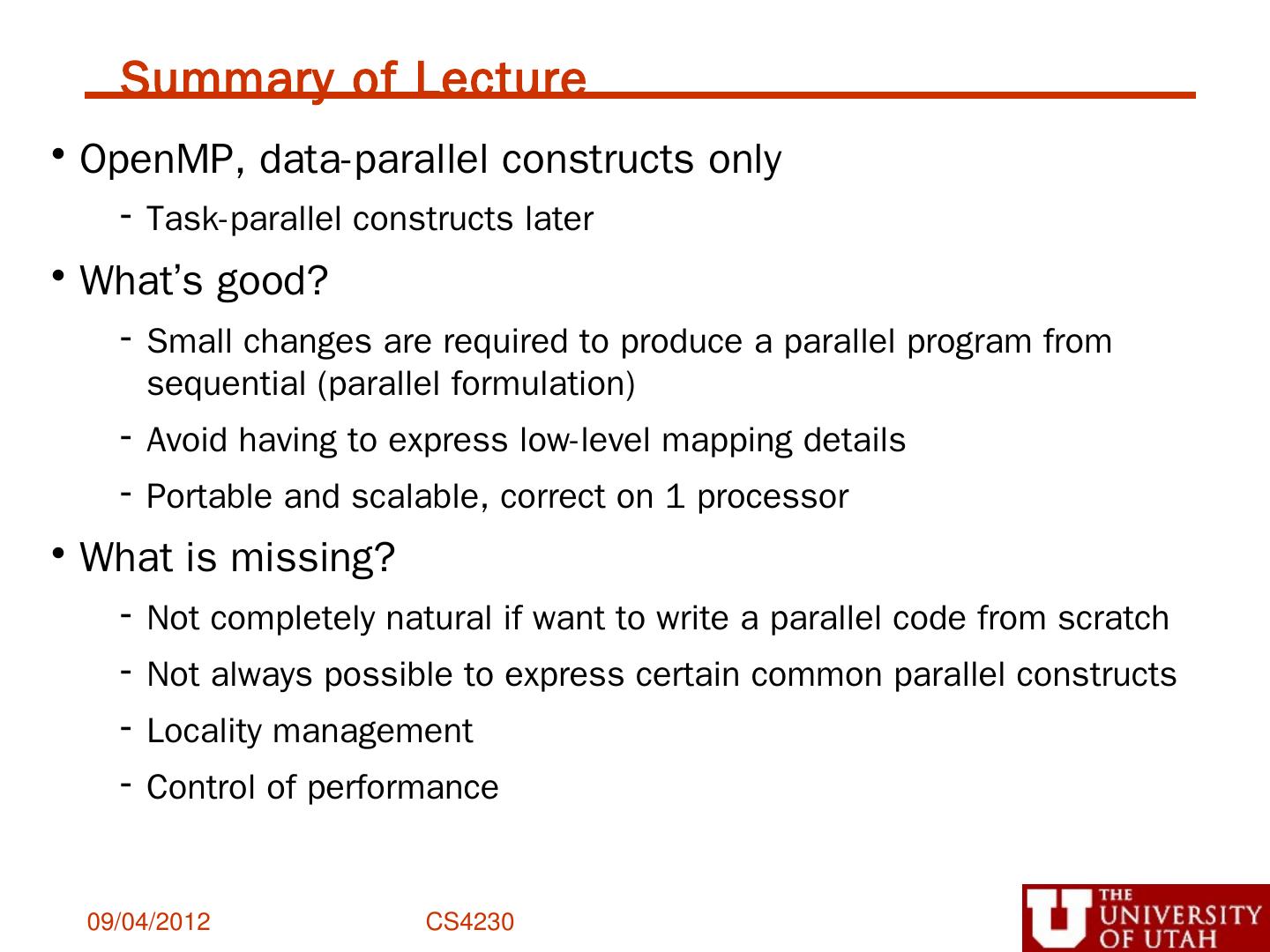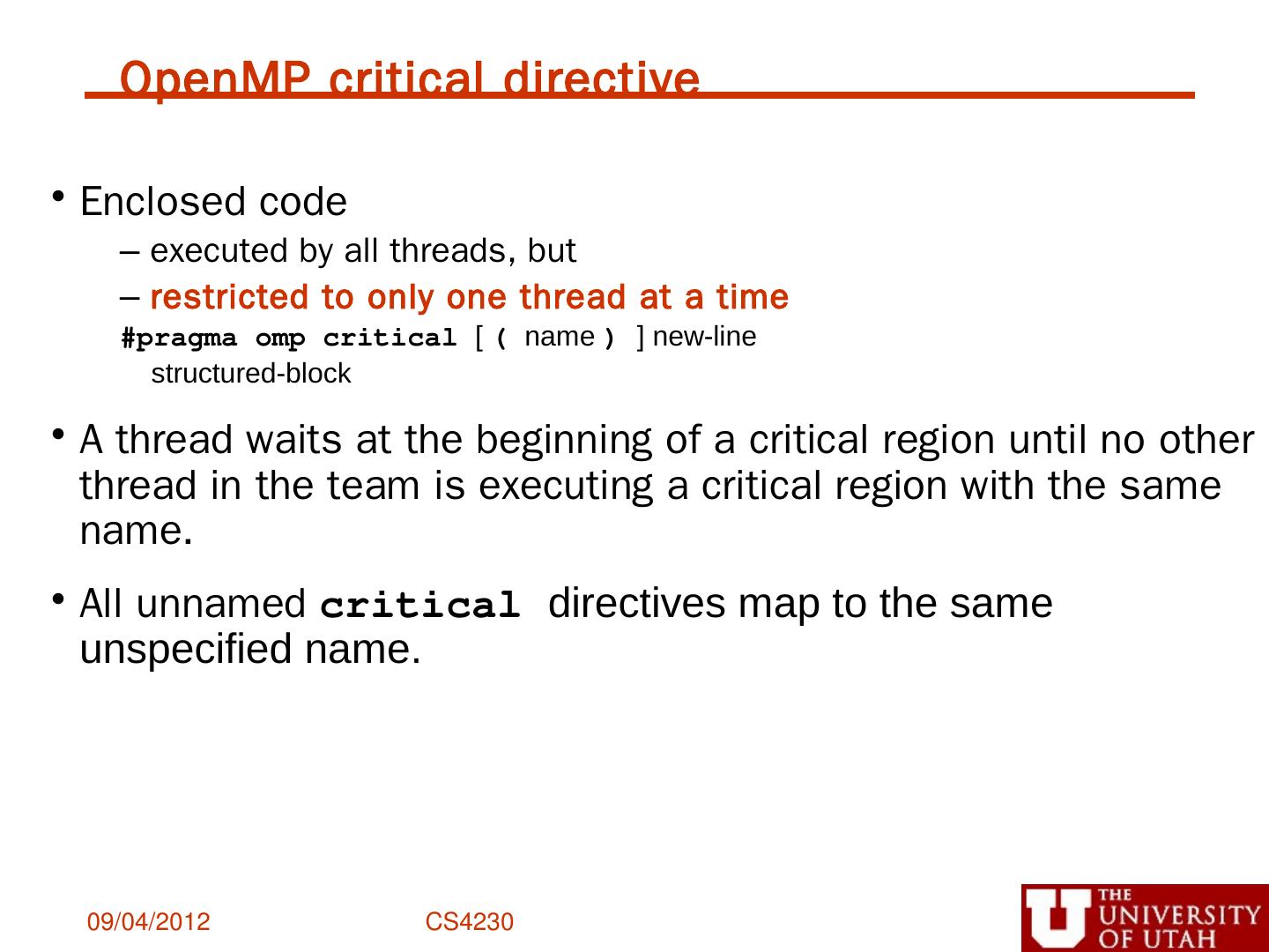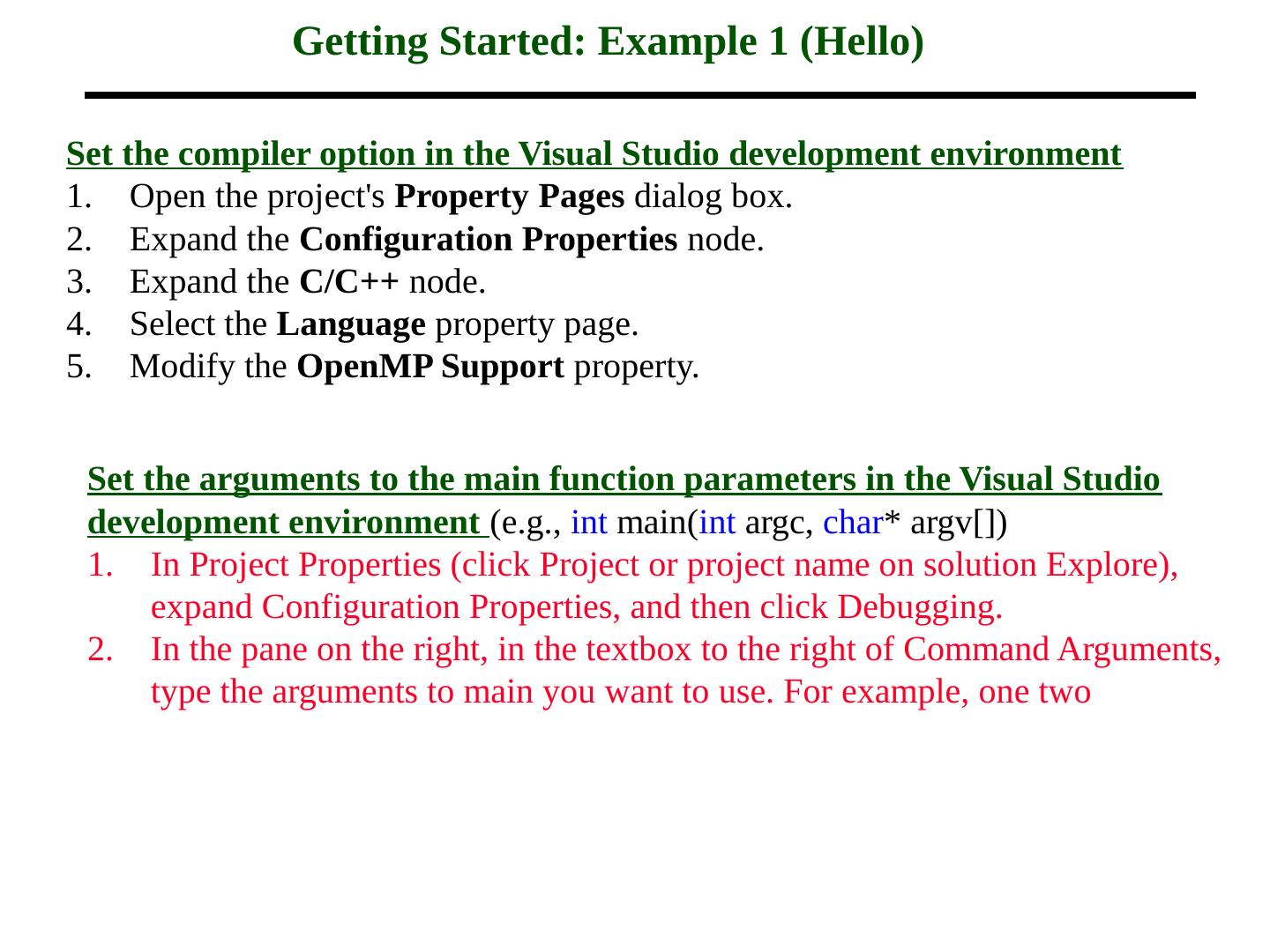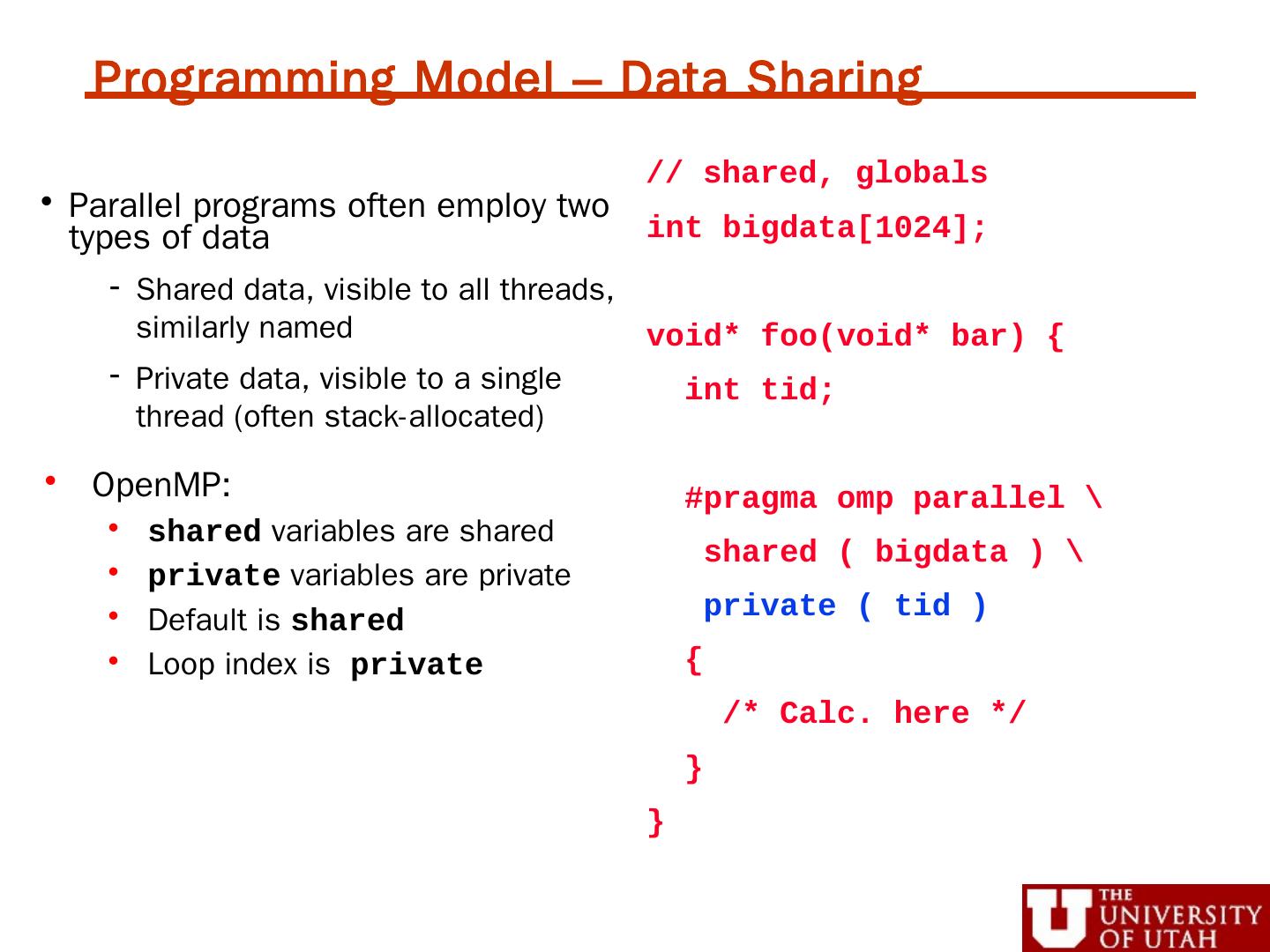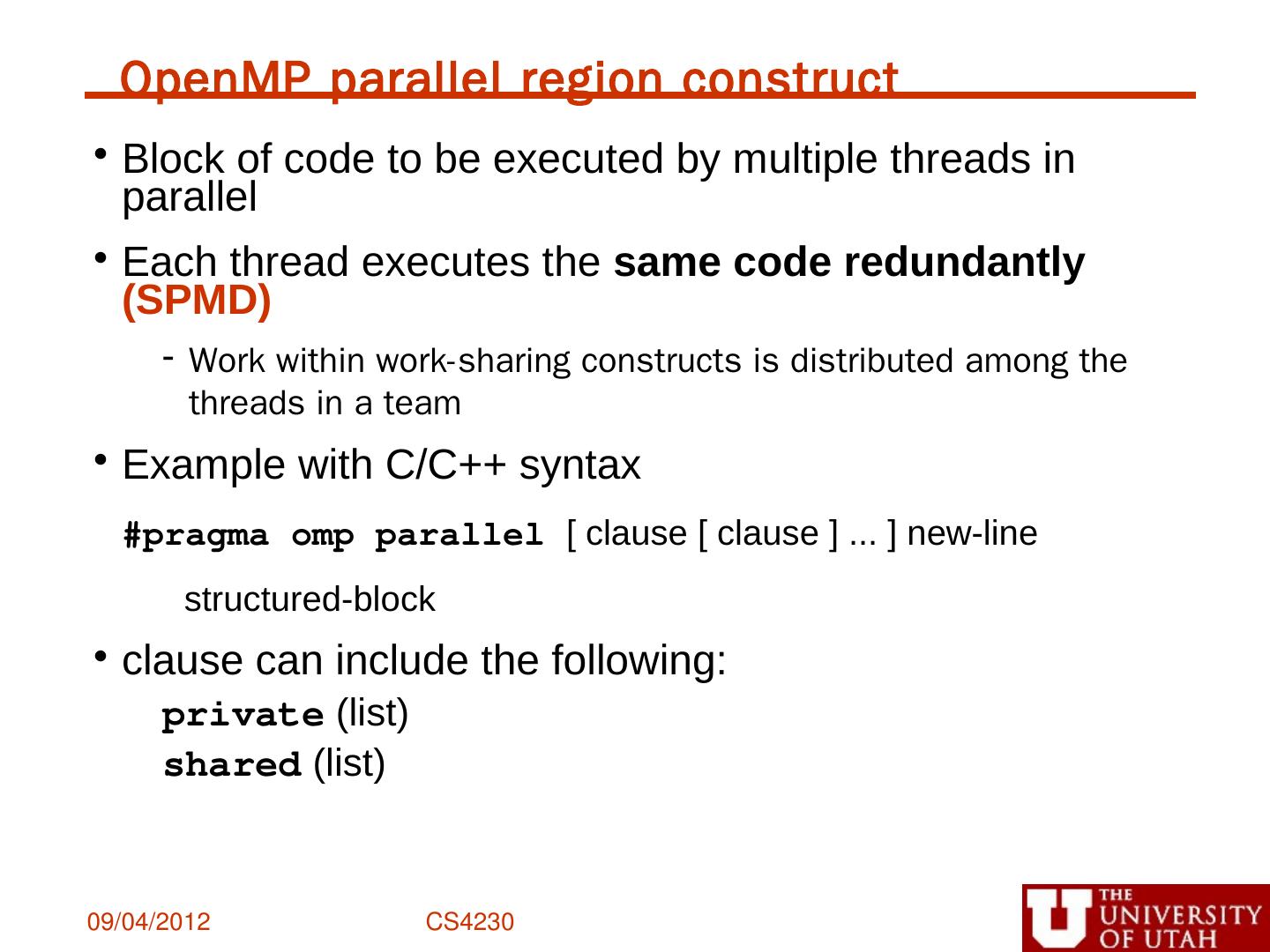 Example with C/C++ syntax. #pragma omp parallel [ clause [ clause ] ... ] new-line. structured-block. clause can include the following: private (list). shared (list).