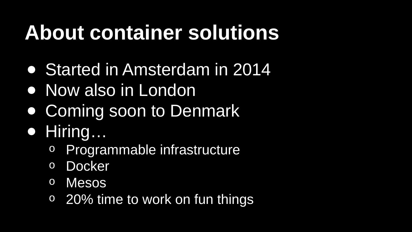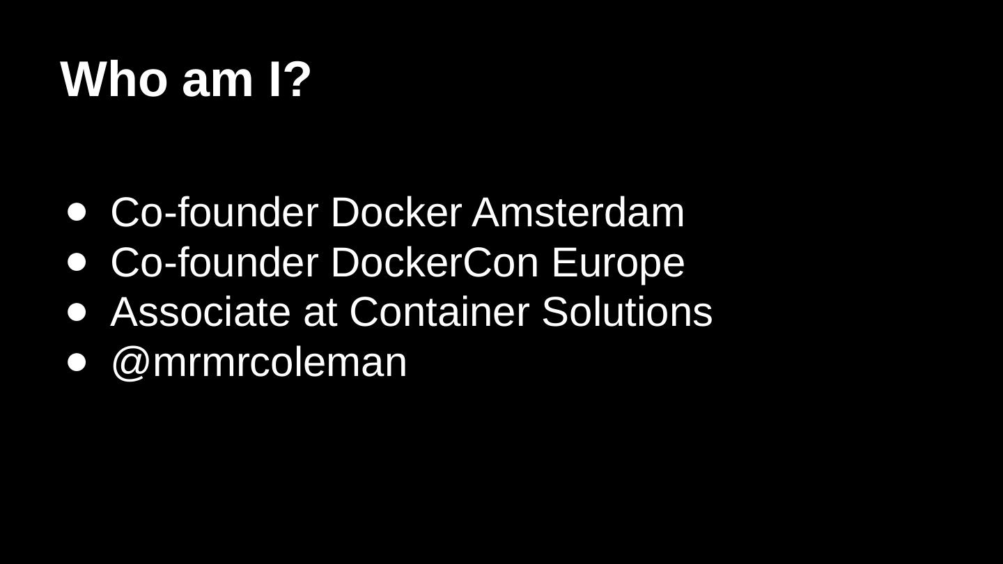 Who am I? Co-founder Docker Amsterdam; Co-founder DockerCon Europe; Associate at Container Solutions; @mrmrcoleman. About container solutions.