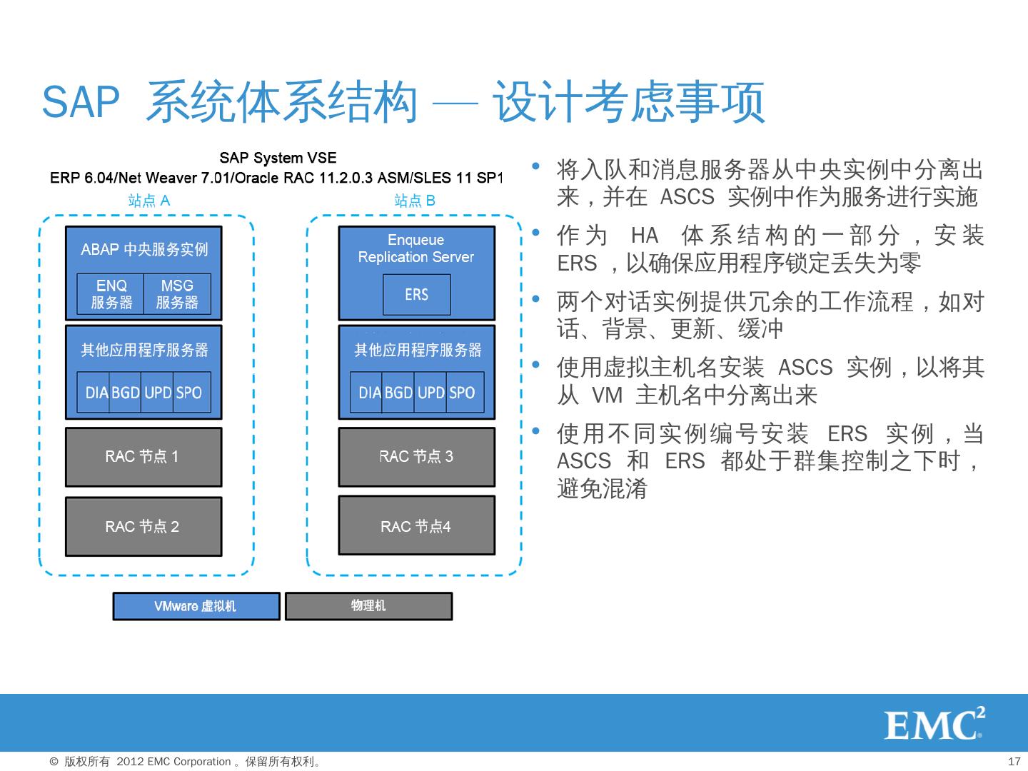 操作系统. SUSE Linux Enterprise Server (SLES) for SAP Applications 11 SP1 ... 使用ERS 配置更新ASCS、ERS、启动和对话实例配置文件; SAP 共享文件系统存储 ...