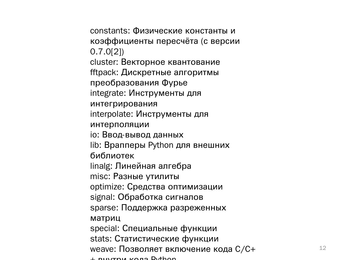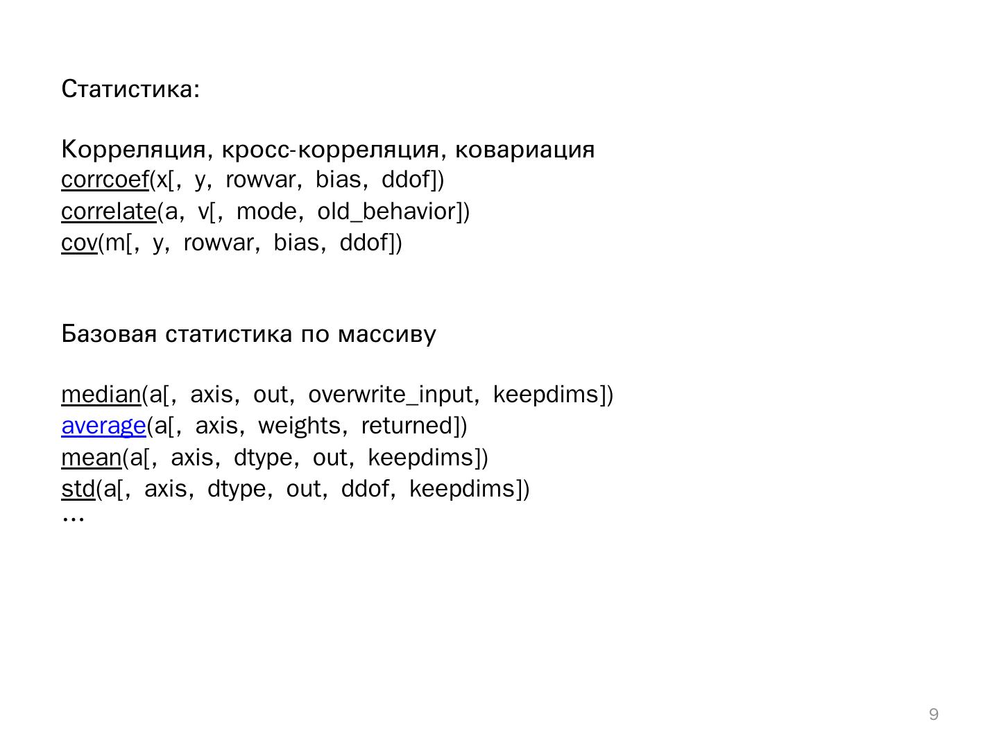 Пакет Numpy включает модули для эффективной работы с многомерными массивами, матрицами, функции для генерации псевдослучайных чисел, ...