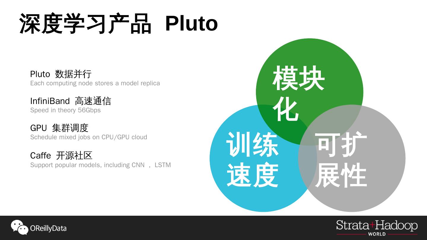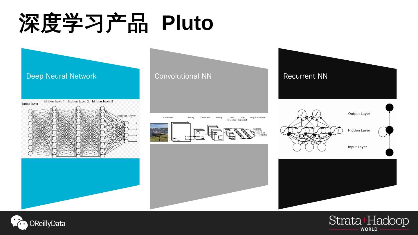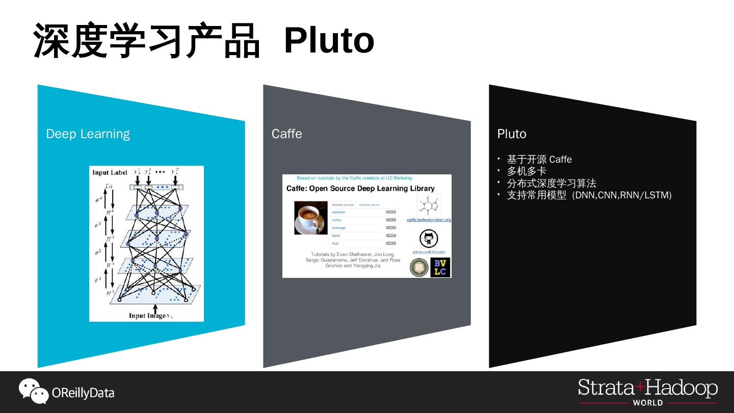 基于开源Caffe; 多机多卡; 分布式深度学习算法; 支持常用模型(DNN,CNN,RNN/LSTM). 深度学习产品Pluto. Deep Neural Network. Convolutional NN. Recurrent NN.
