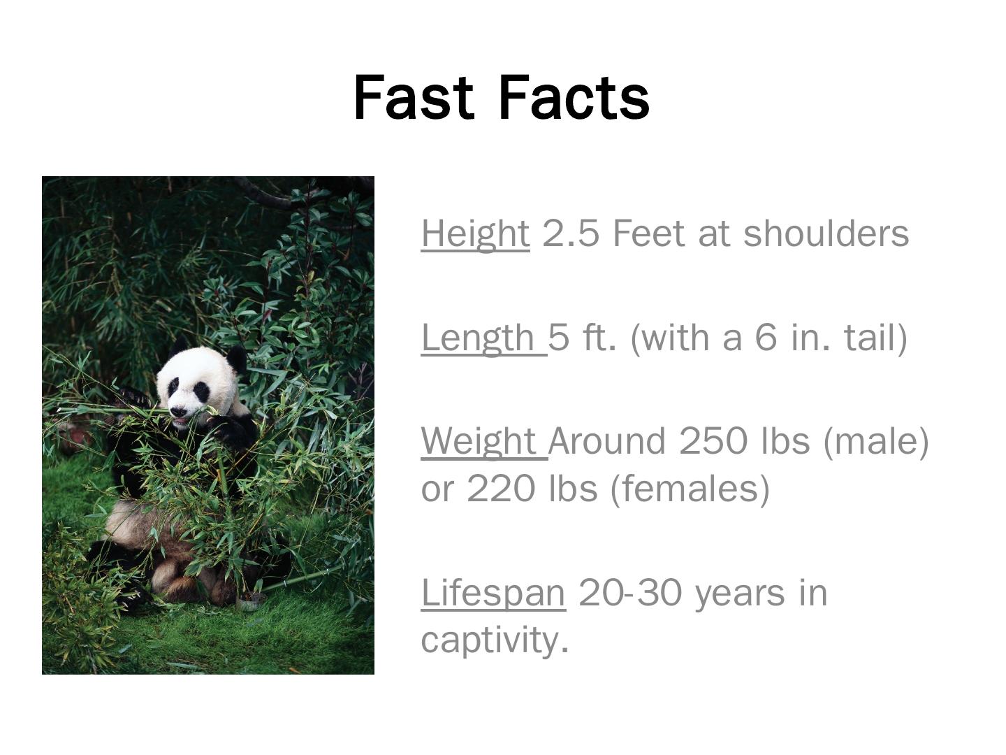 The Giant Panda. By: Anne Jamieson. Ambassador for All Endangered Animals. Fast Facts. Height 2.5 Feet at shoulders. Length 5 ft. (with a 6 in. tail).