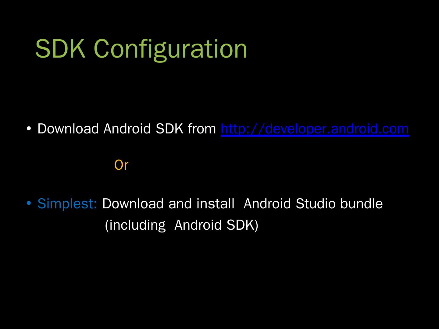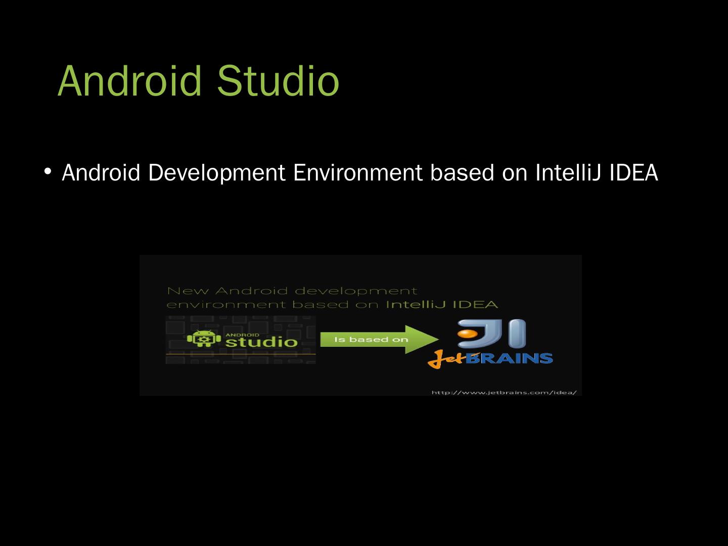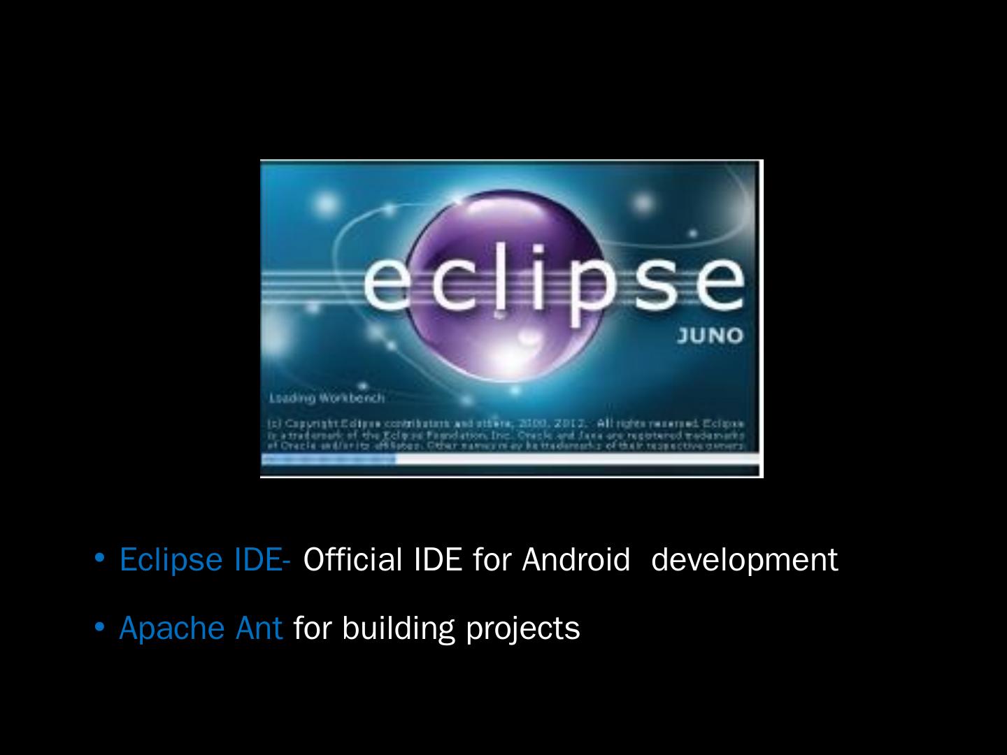 Eclipse IDE- Official IDE for Android development. Apache Ant for building projects. Android Development Environment based on IntelliJ IDEA. Android Studio.