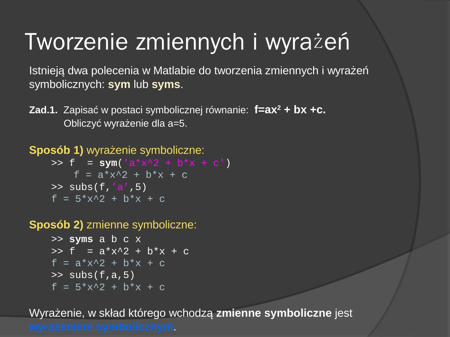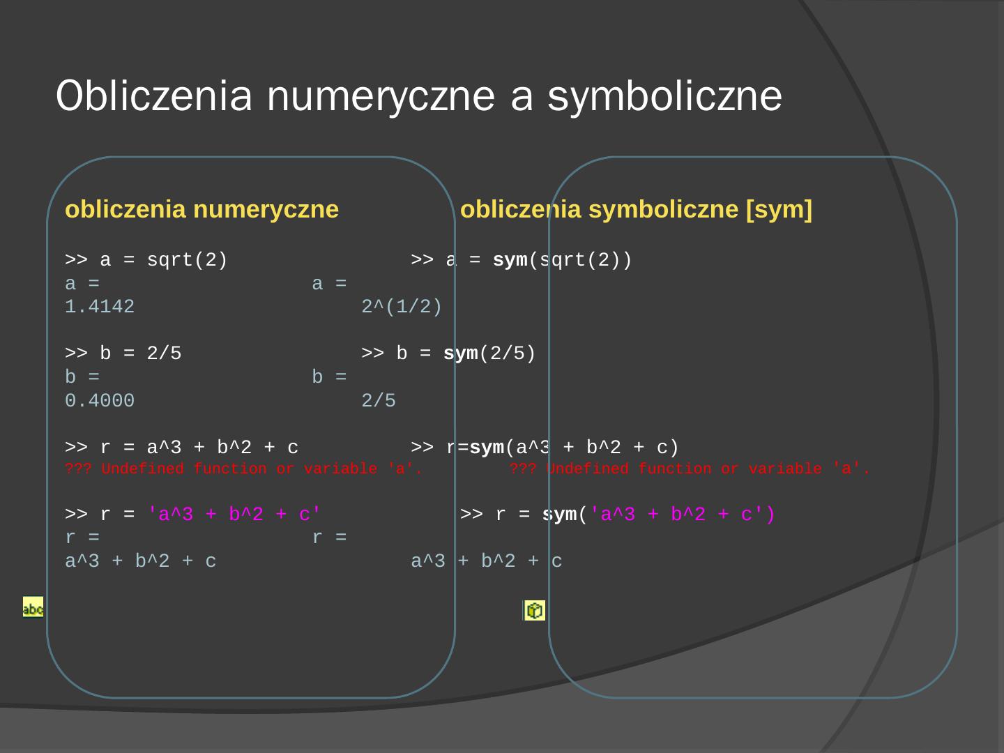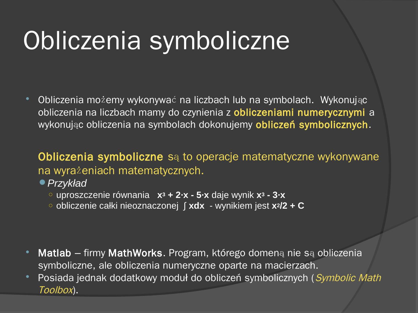 w MATLAB'ie. Symbolic Math Toolbox. Anna Tomkowska. Politechnika Koszalińska. Obliczenia symboliczne. Obliczenia możemy wykonywać na liczbach lub na ...