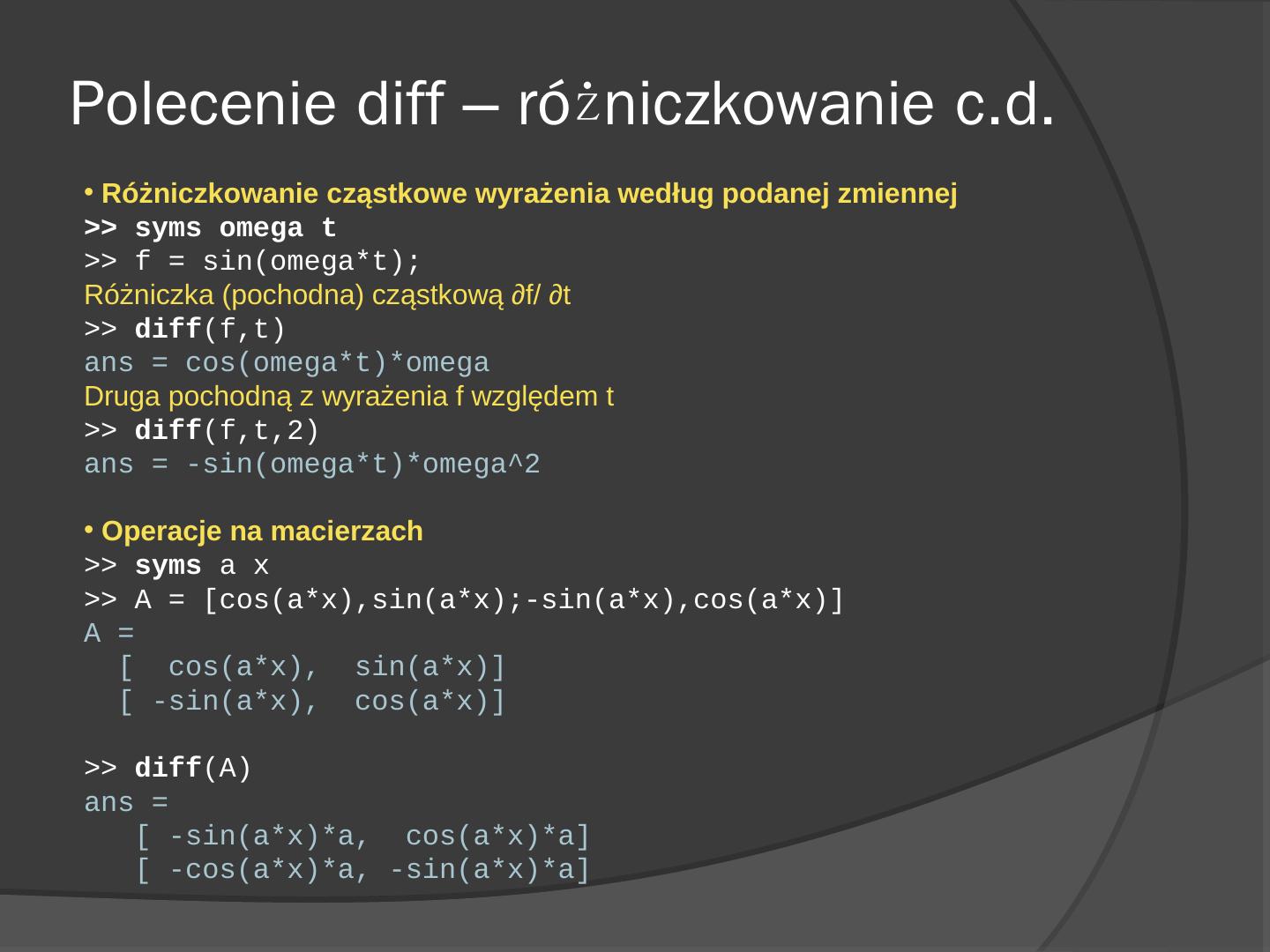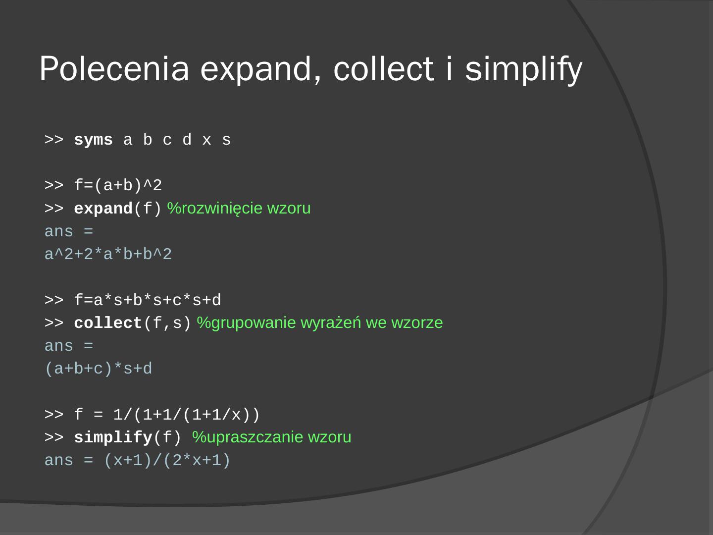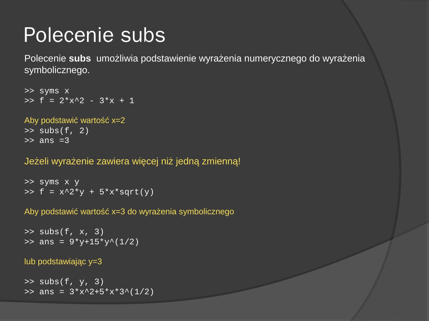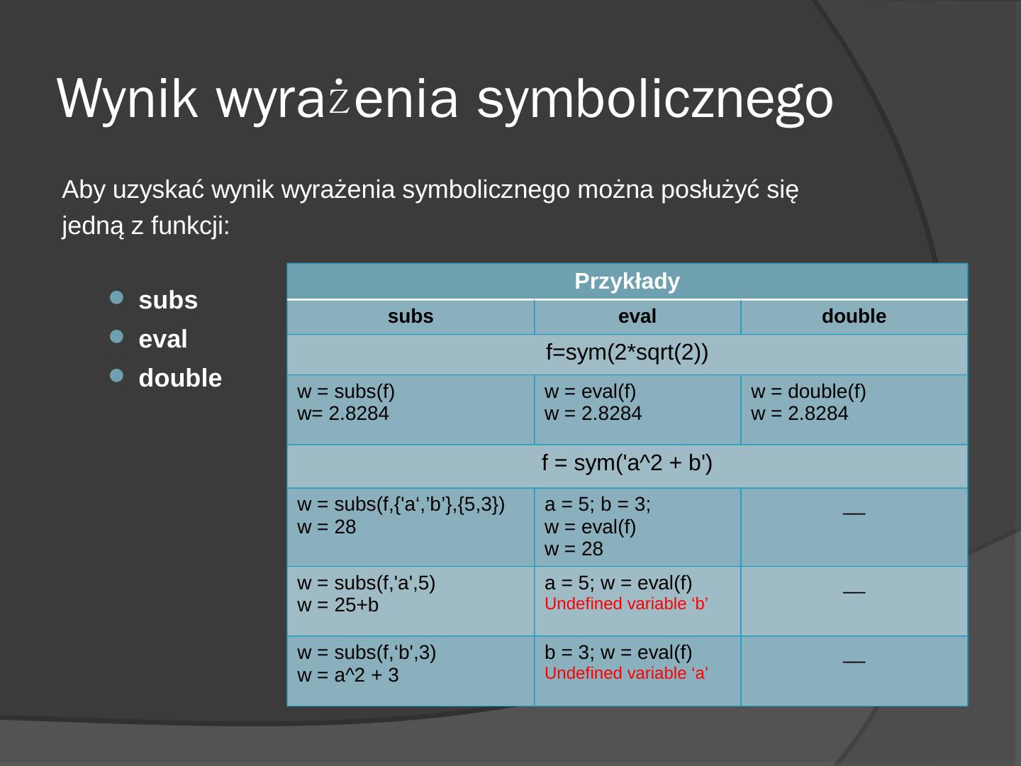 w MATLAB'ie. Symbolic Math Toolbox. Anna Tomkowska. Politechnika Koszalińska. Obliczenia symboliczne. Obliczenia możemy wykonywać na liczbach lub na ...
