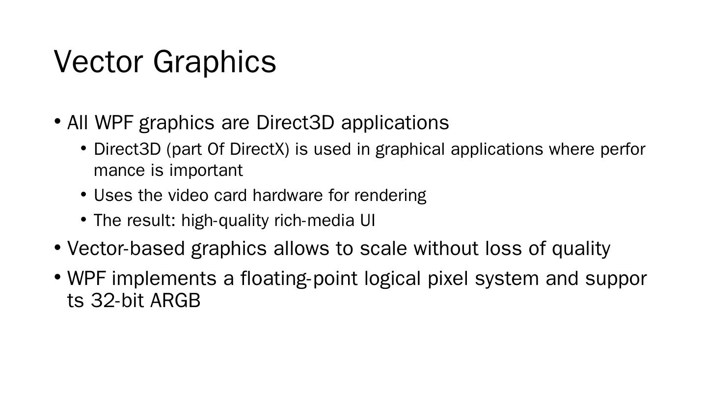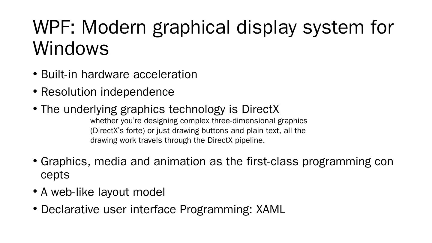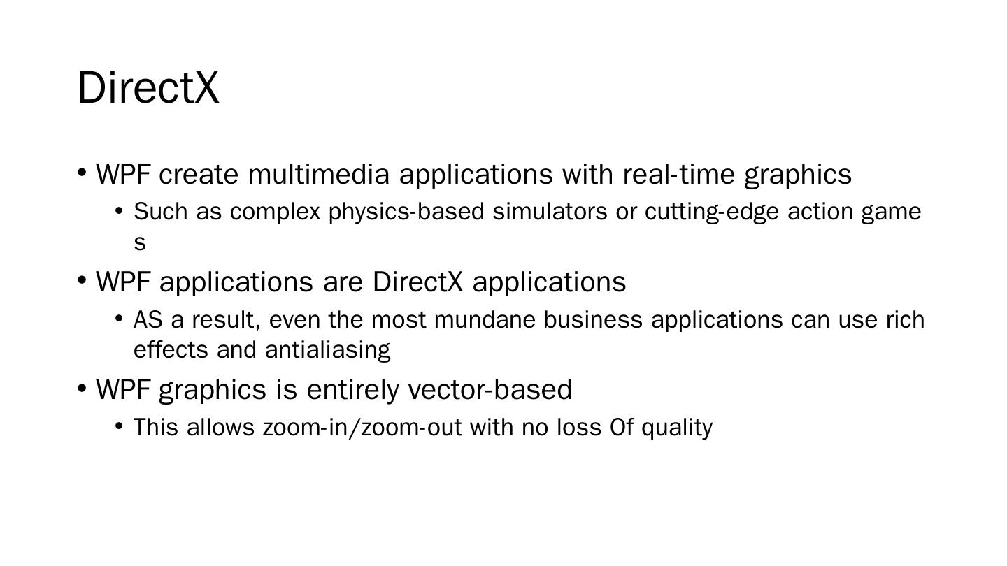 All WPF graphics are Direct3D applications. Direct3D (part Of DirectX) is used in graphical applications where performance is important; Uses the video card ...