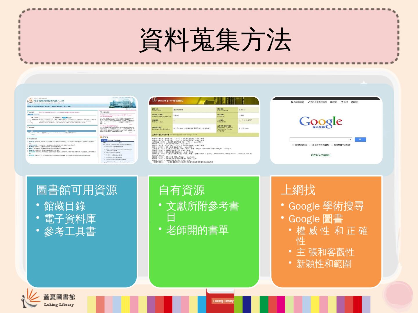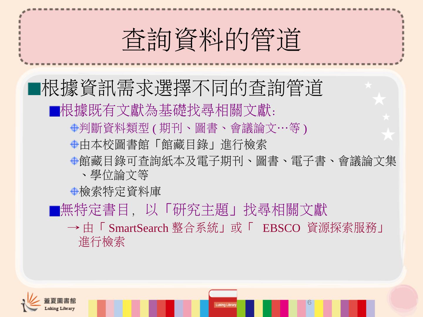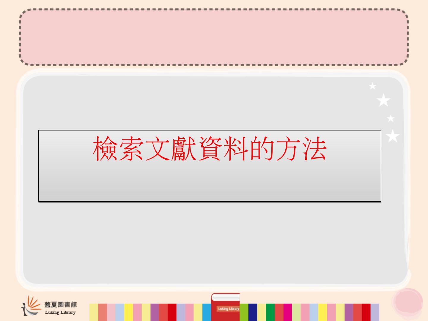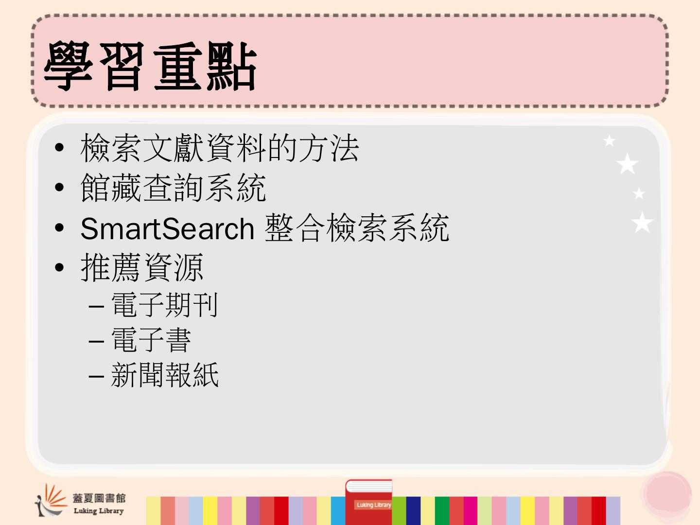 日文系日本文化概論 圖書館資源研習 ... 檢索文獻資料的方法; 館藏查詢系統; SmartSearch整合檢索系統; 推薦資源. 電子期刊; 電子書; 新聞報紙.