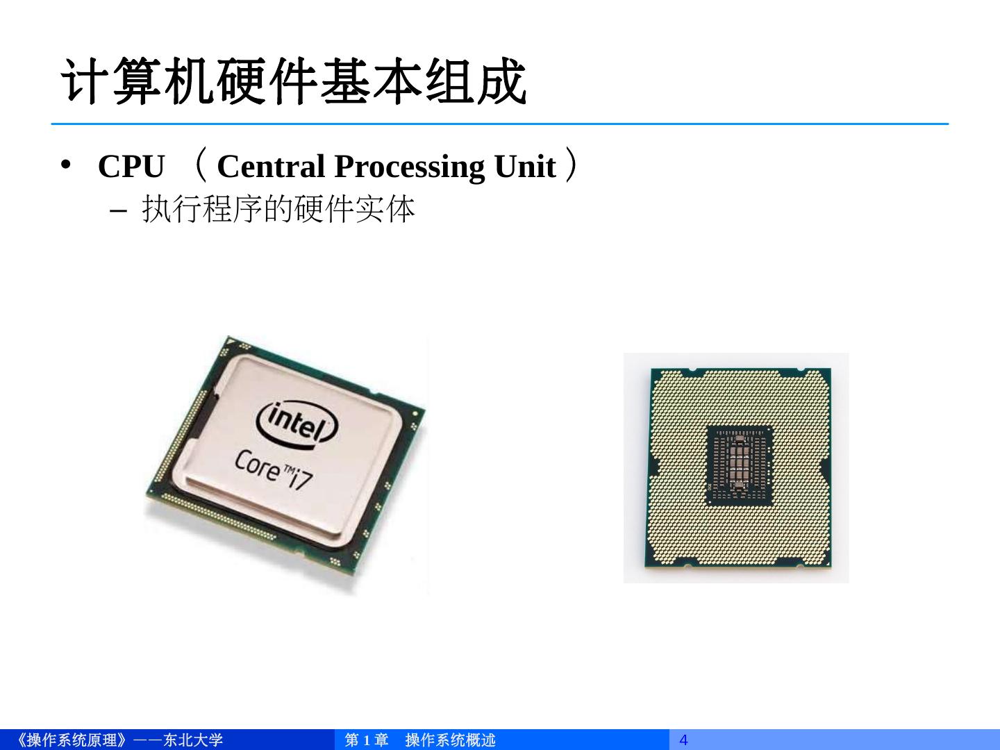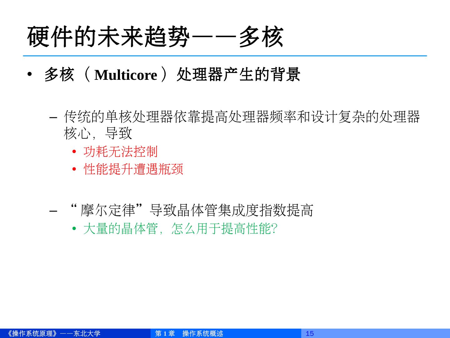 将大量的外设和CPU集成在一个芯片中. 集成度高,多用于嵌入式系统. 《操作系统原理》——东北大学. 14. *1* ******. 硬件的未来趋势——多核. 多核(Multicore)处理器 ...