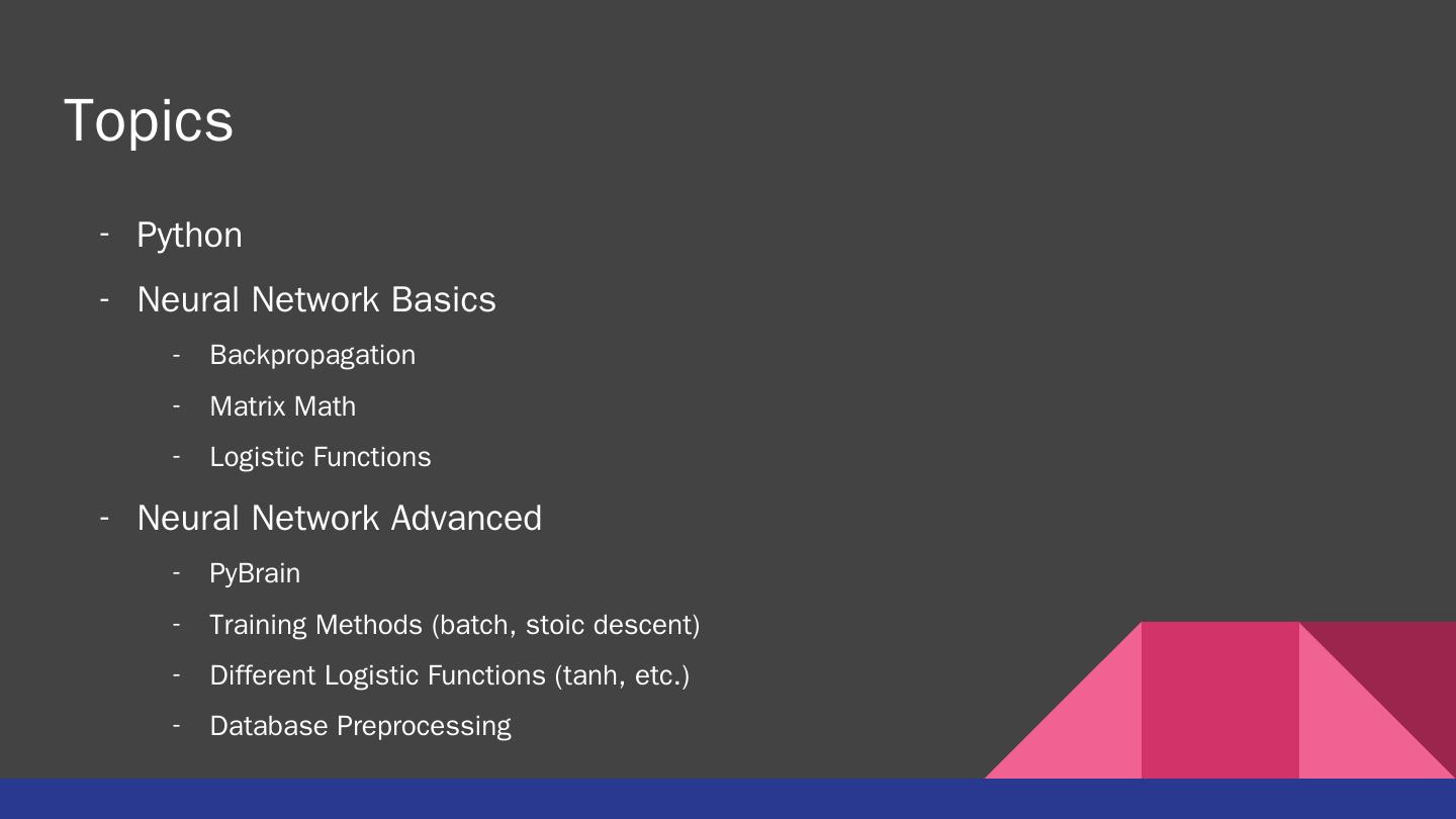 Convolutional/Pooling/Normalization layers; Theano / Tensorflow; Softmax layers; Relu function. SVMs; Reinforcement Learning; Robotics Applications.