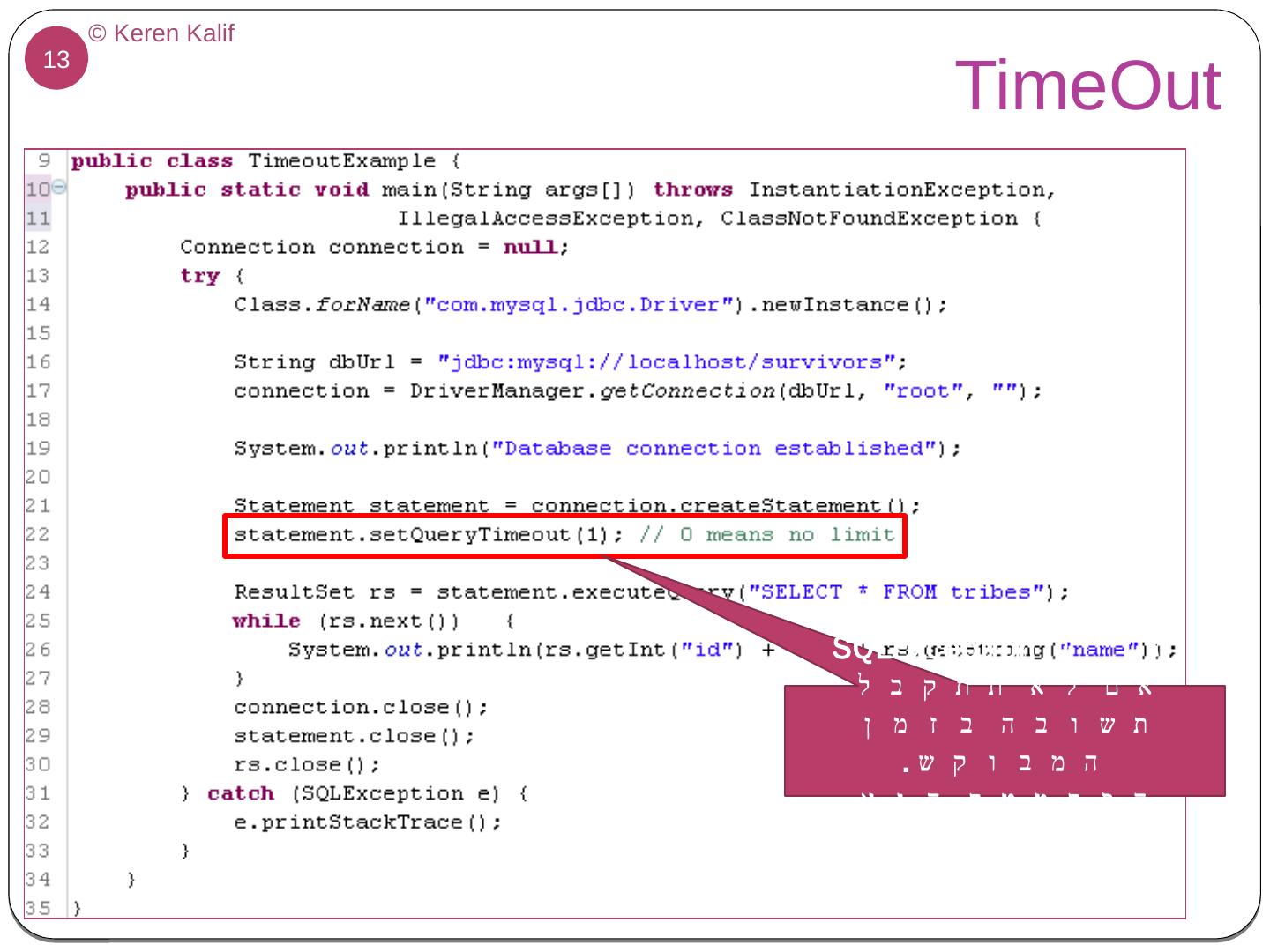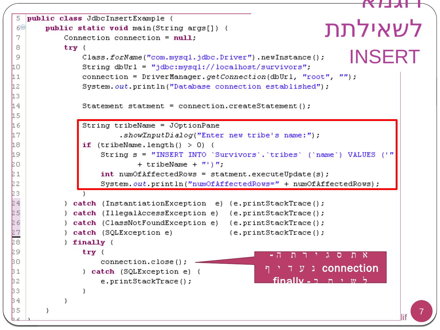 טעינת הדרייבר של מנהל ה- JDBC, בדוגמא זו של MySql. הגדרת מיקום ה- DB ושמו. יכול כמובן להיות על מחשב מרוחק. הרצת שאילתא והצגת התוצאות. סגירת ה- connection.