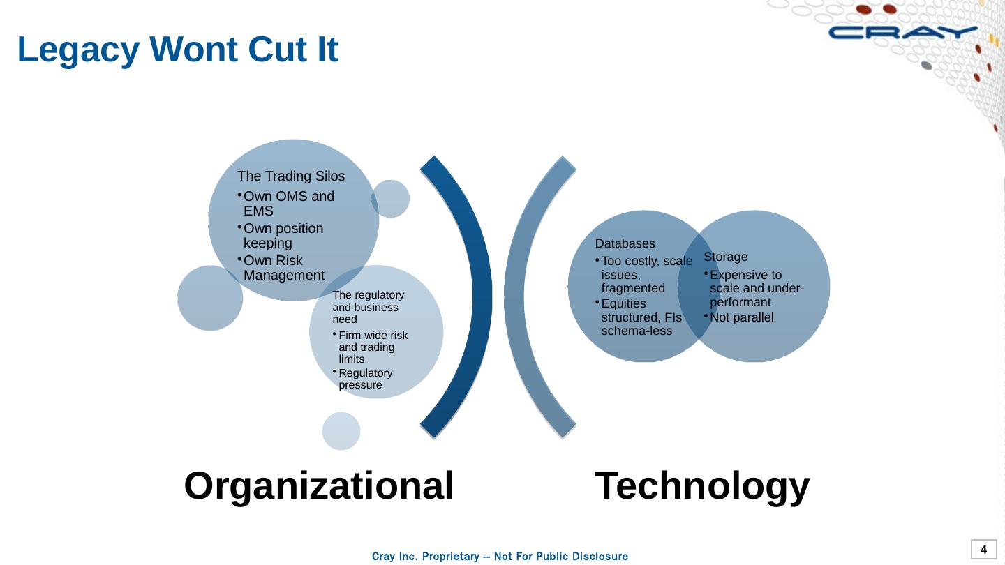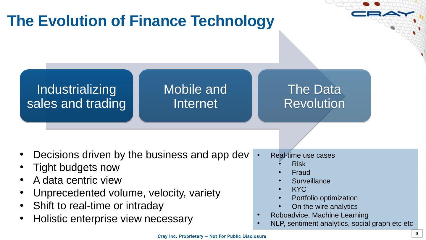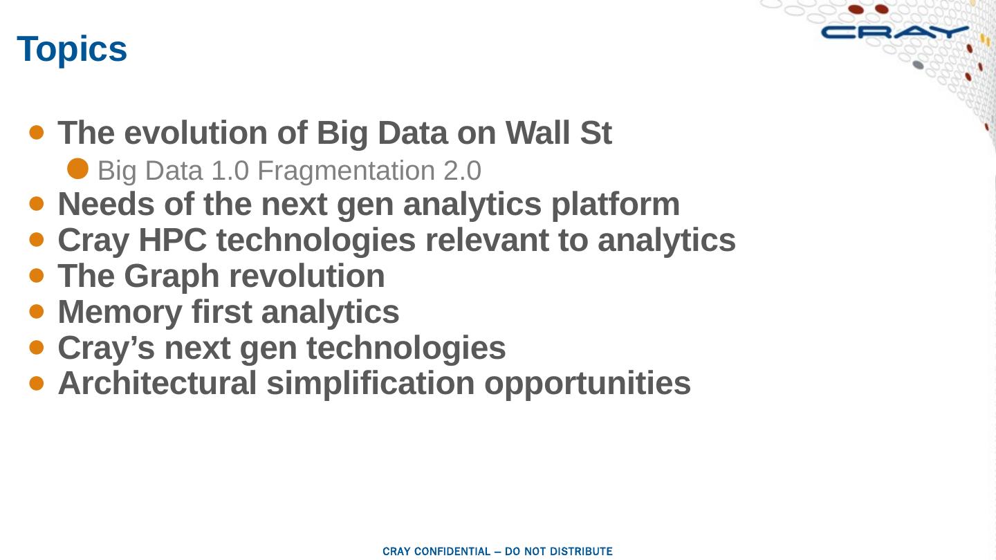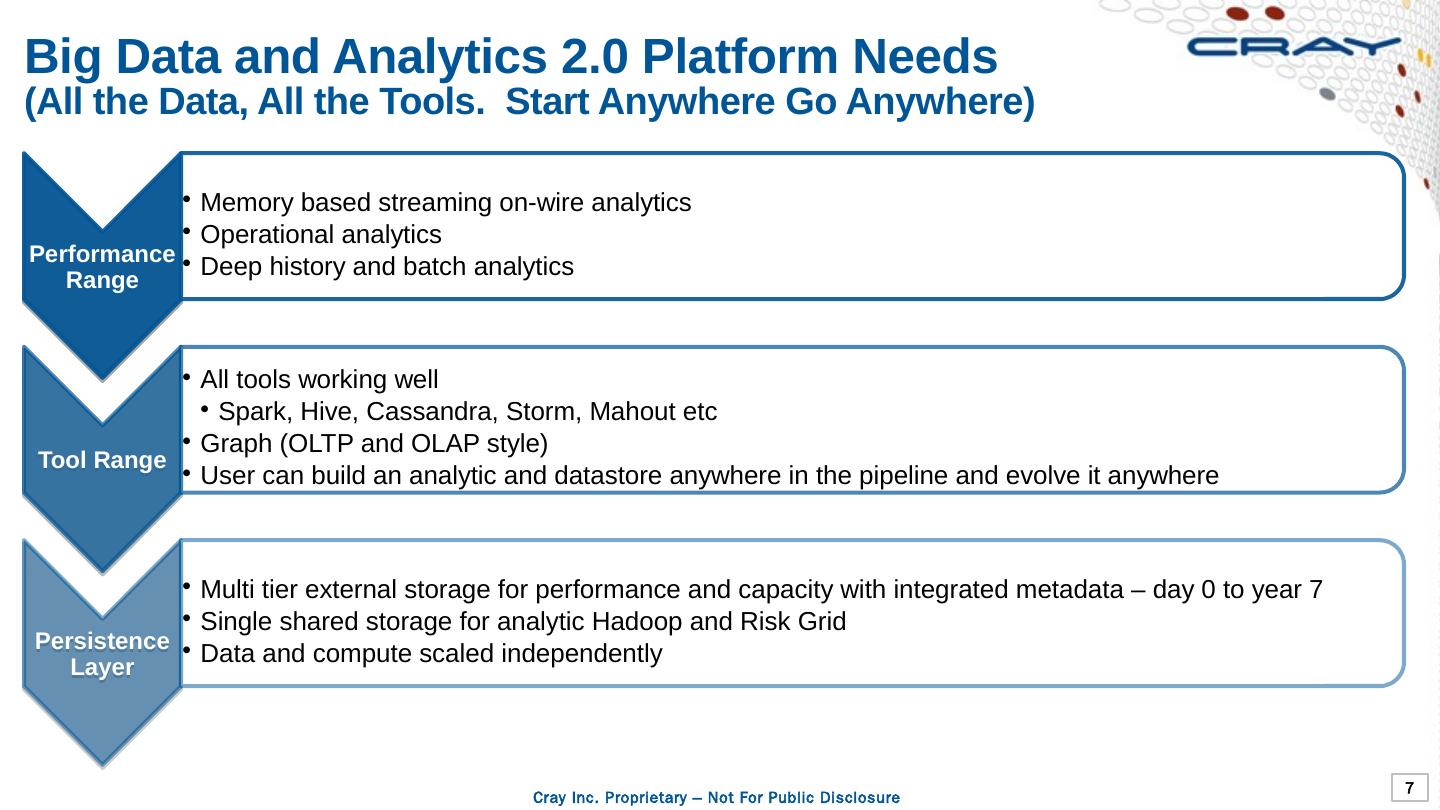 Too costly, scale issues, fragmented; Equities structured, FIs schema-less ... Memory based streaming on-wire analytics; Operational analytics; Deep history and ... Hadoop, Spark, and future workloads; Batch and low-latency; Data mining, ...