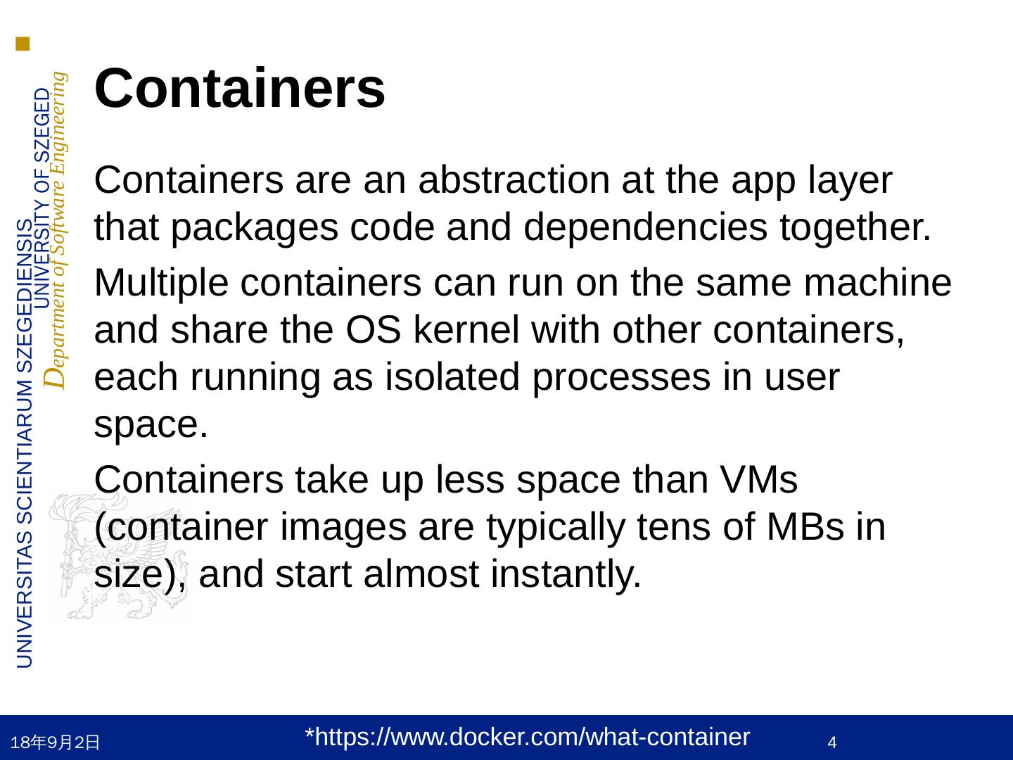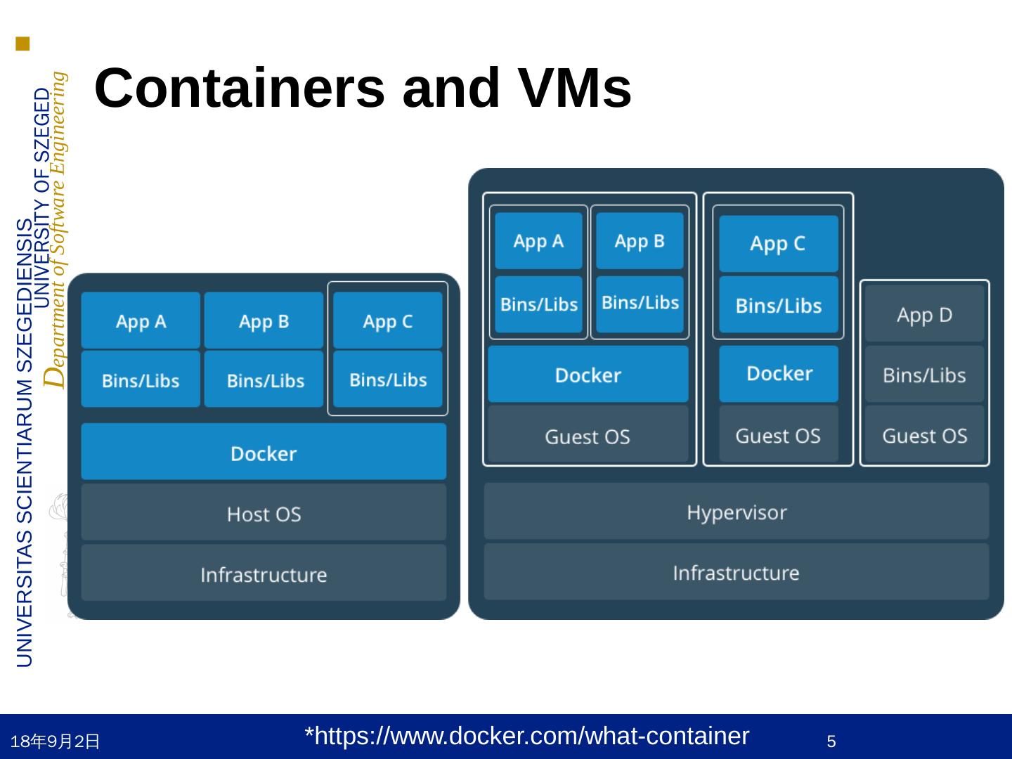*https://www.docker.com/what-container. UNIVERSITY OF SZEGED. Department of Software Engineering. UNIVERSITAS SCIENTIARUM SZEGEDIENSIS. VMs.