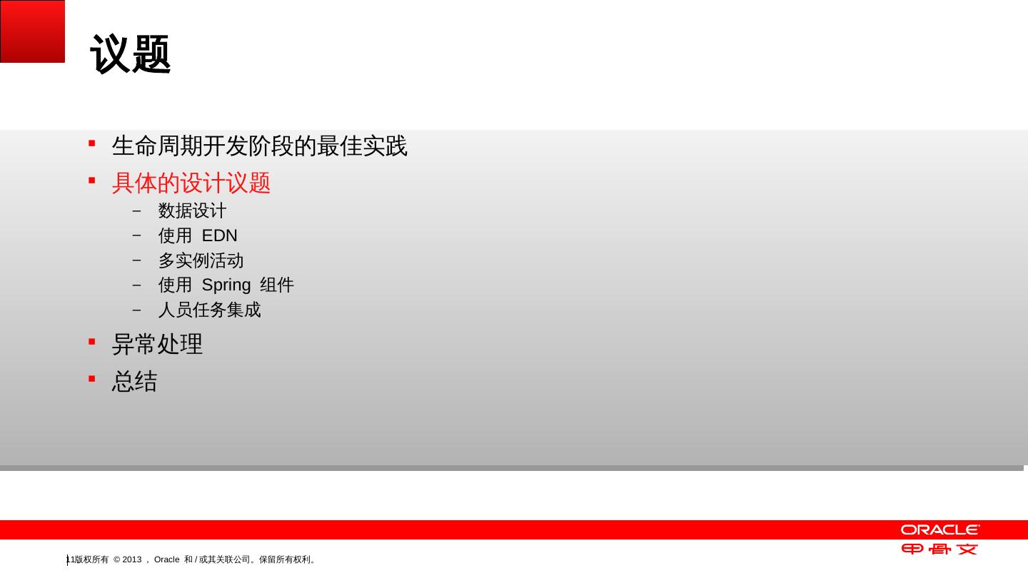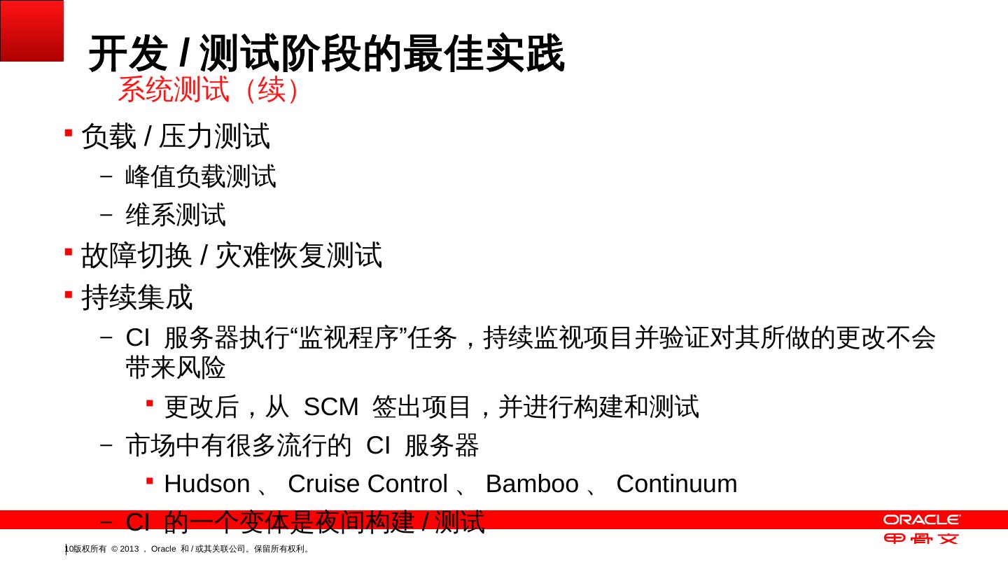 9. 开发/测试阶段的最佳实践. 集成测试. 使用SOAP 消息生成器进行同步测试. soapUI、XMLUnit ... 测试; 持续集成. CI 服务器执行“监视程序”任务,持续监视项目并验证对其所做的更改不会带来风险 ... 信息板用户增加系统的整体负载. 关键设计注意 ...