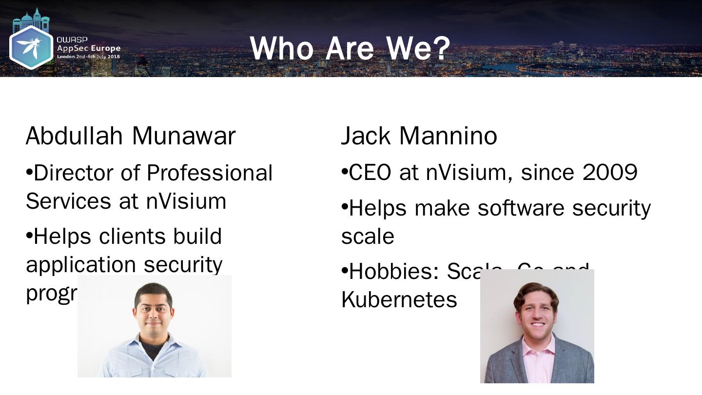 Jack Mannino. CEO at nVisium, since 2009; Helps make software security scale; Hobbies: Scala, Go and Kubernetes. Container Security Lifecycle. Design.