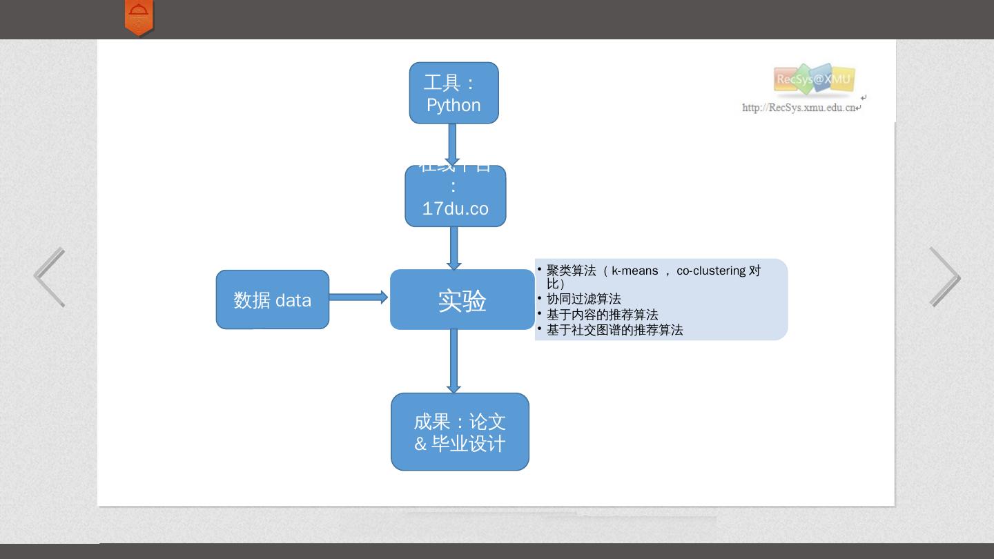 聚类算法(k-means,co-clustering对比); 协同过滤算法; 基于内容的推荐算法; 基于社交图谱的推荐算法. 实验. 在线平台:17du.com. 数据data. 成果:论文. &毕业设计.