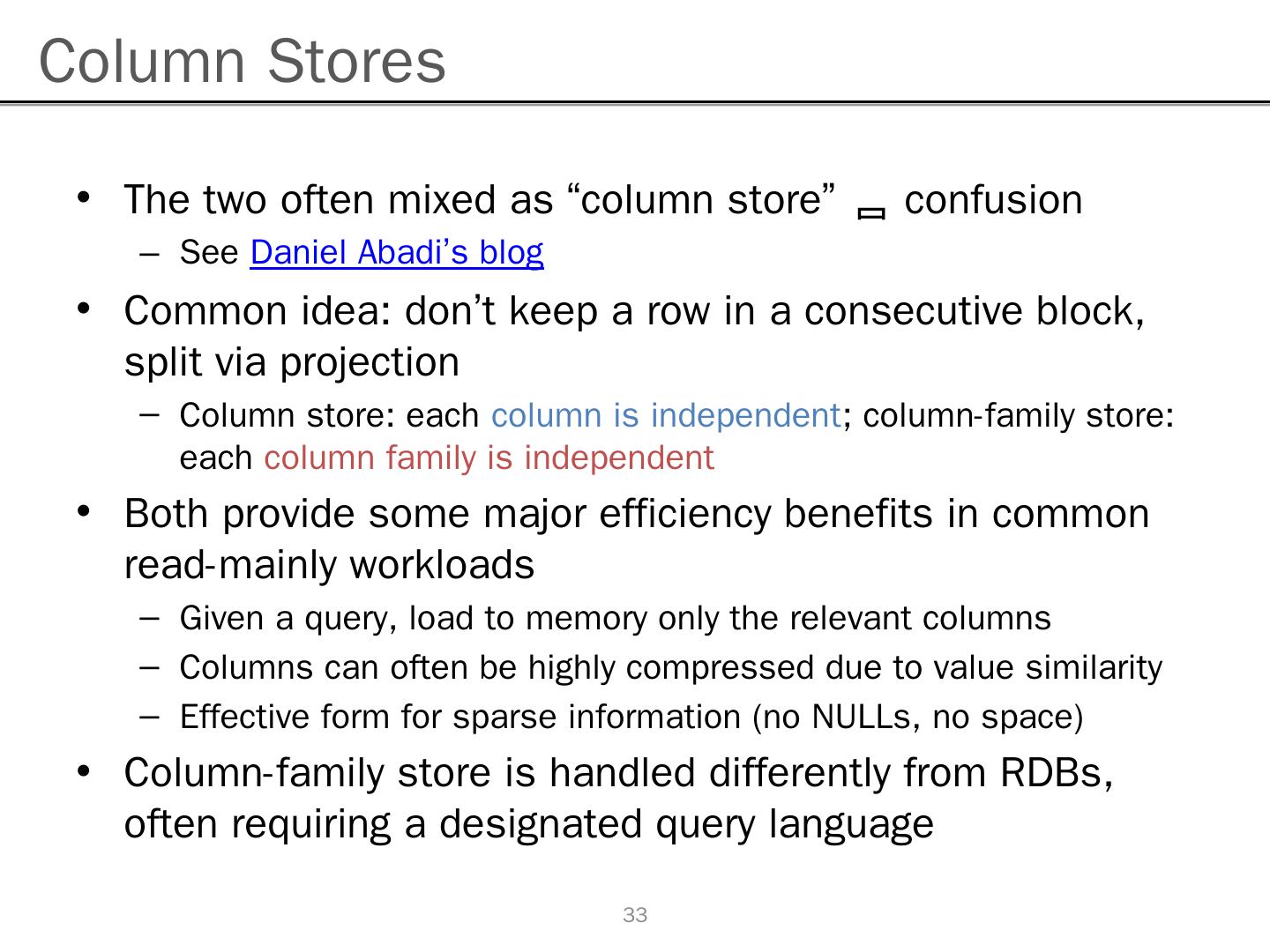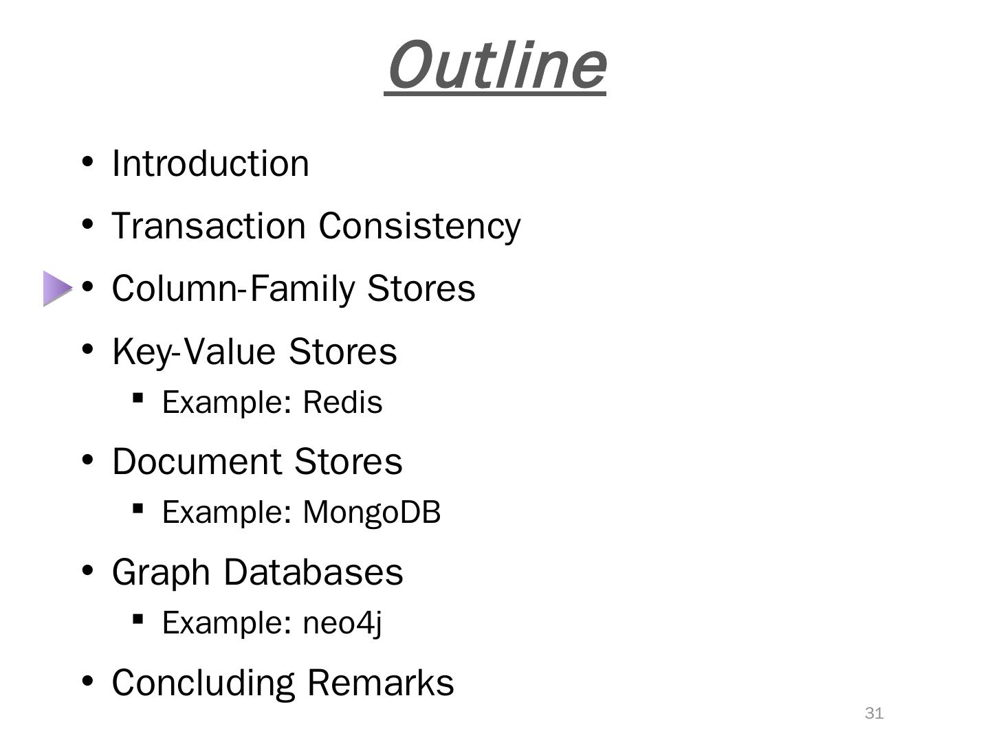 Transaction Consistency; Column-Family Stores; Key-Value Stores. Example: Redis. Document Stores. Example: MongoDB. Graph Databases. Example: neo4j.